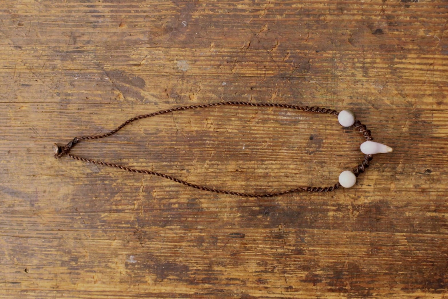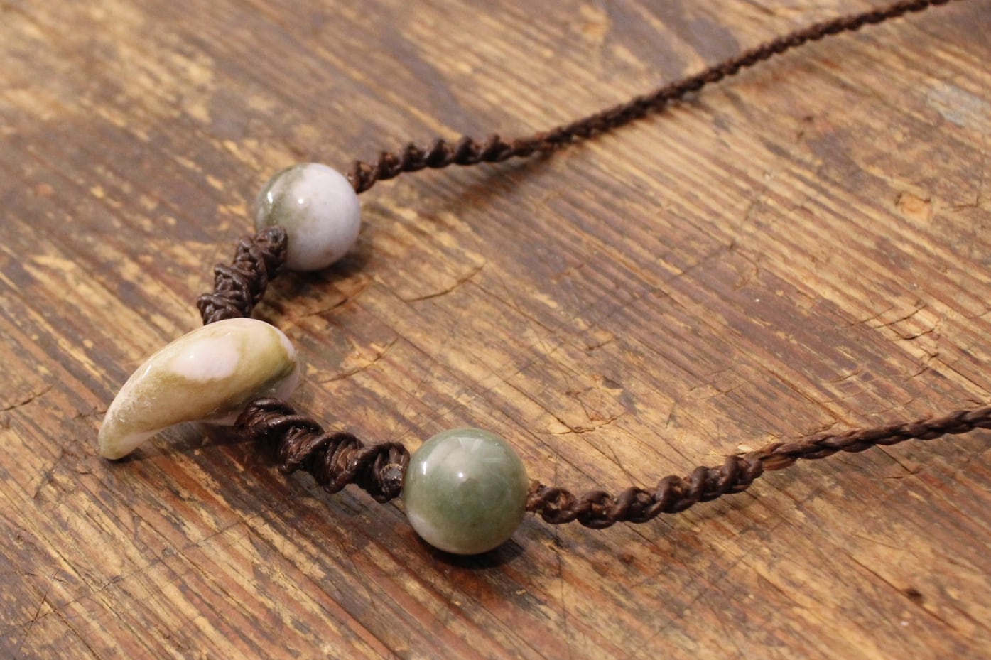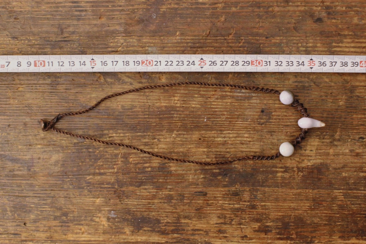 This necklace is made of Burmese jade Maga tama. Wax Cotton are used for the material of the band. It is woven in the style of the ethnic minorities of Southeast Asia.