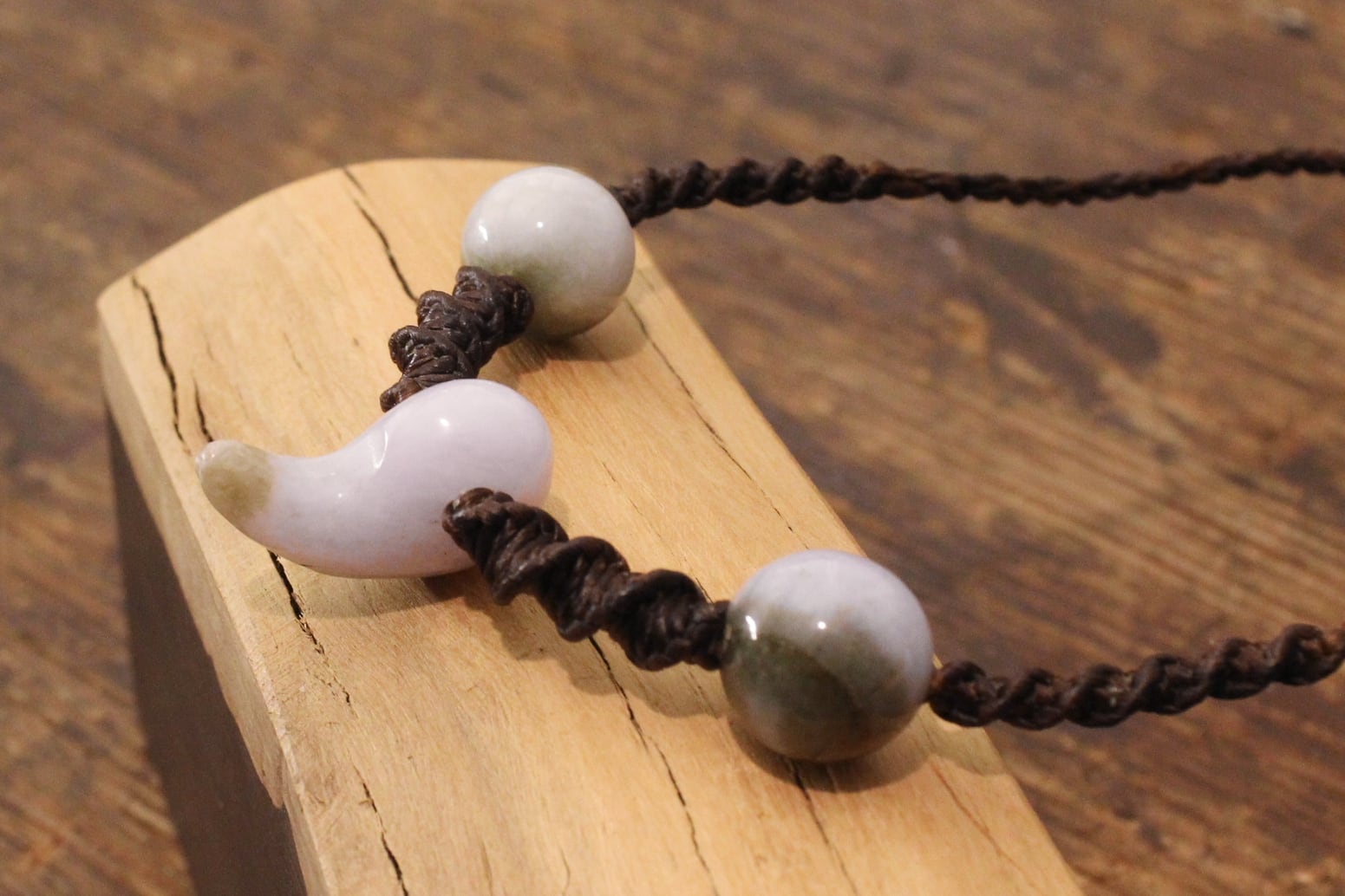 ビルマ産本翡翠の勾玉を現地で買い付け、東南アジアの少数民族であるアカ族の様式で編んでもらったオリジナルネックレスです。