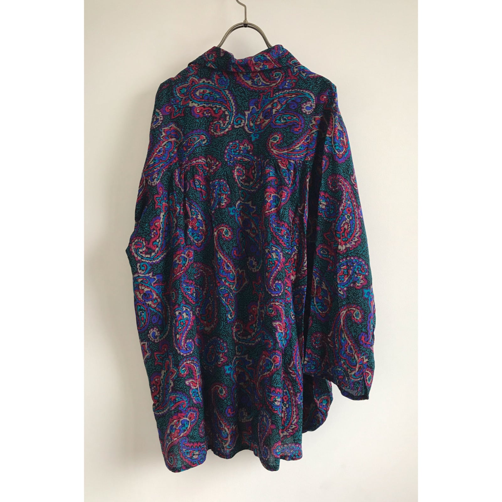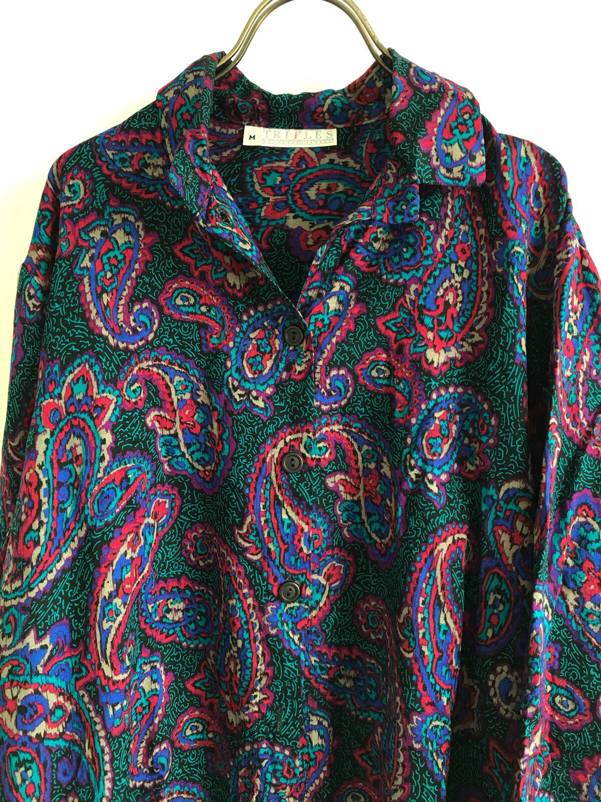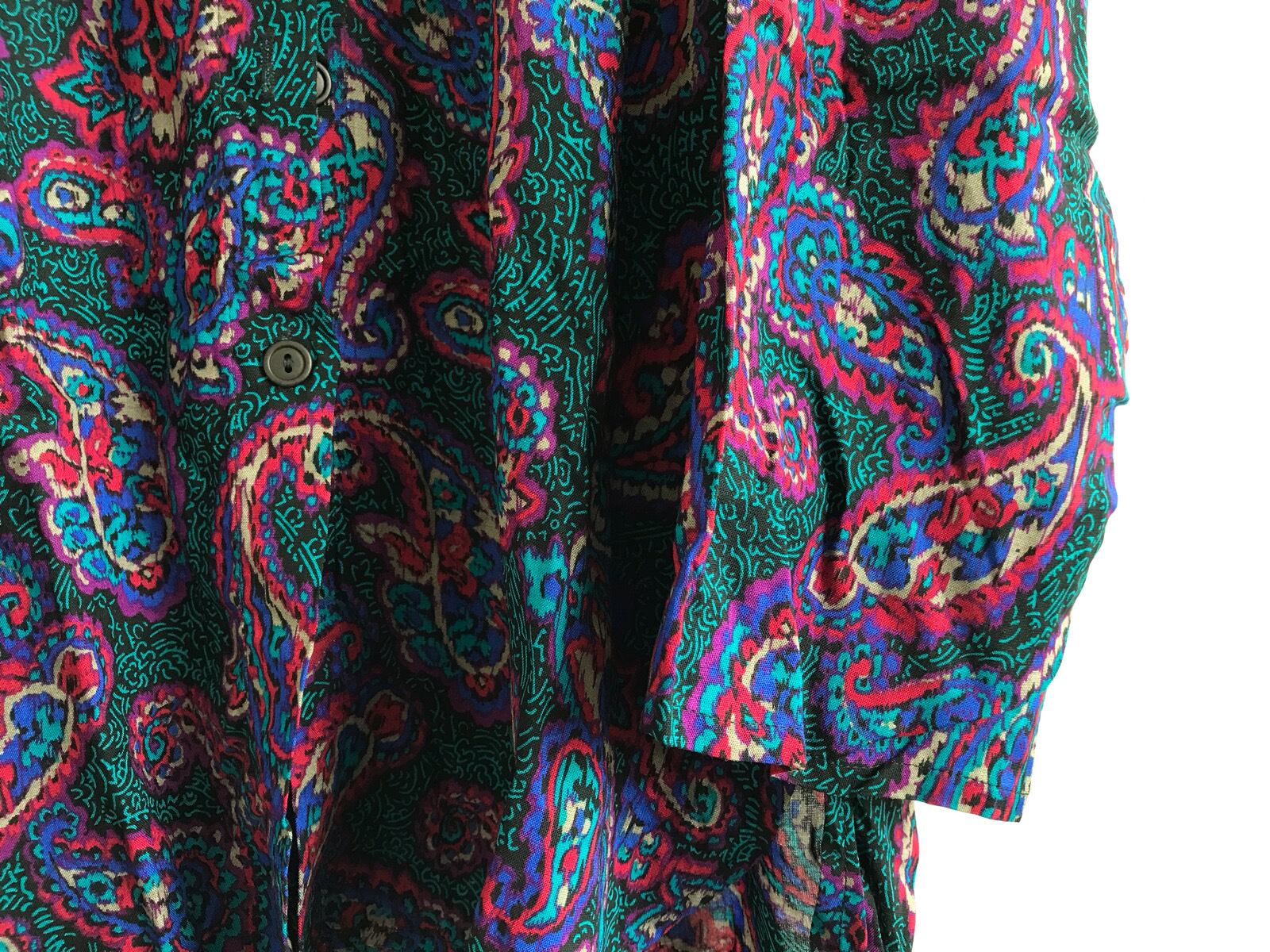 【 USA製 古着 ★ ペイズリー柄 】psychedelic cyber matrix paisley pattern long length shirt - made in USA - rayon / USA製 ロング丈 ゆったり ビッグサイズ 総柄シャツ 長袖シャツ 半端袖 七分袖 シャツワンピース レーヨン製 レディース XL ブラウス トップス オーバーサイズ ビンテージ ストリート 派手 奇抜 原宿 秋物