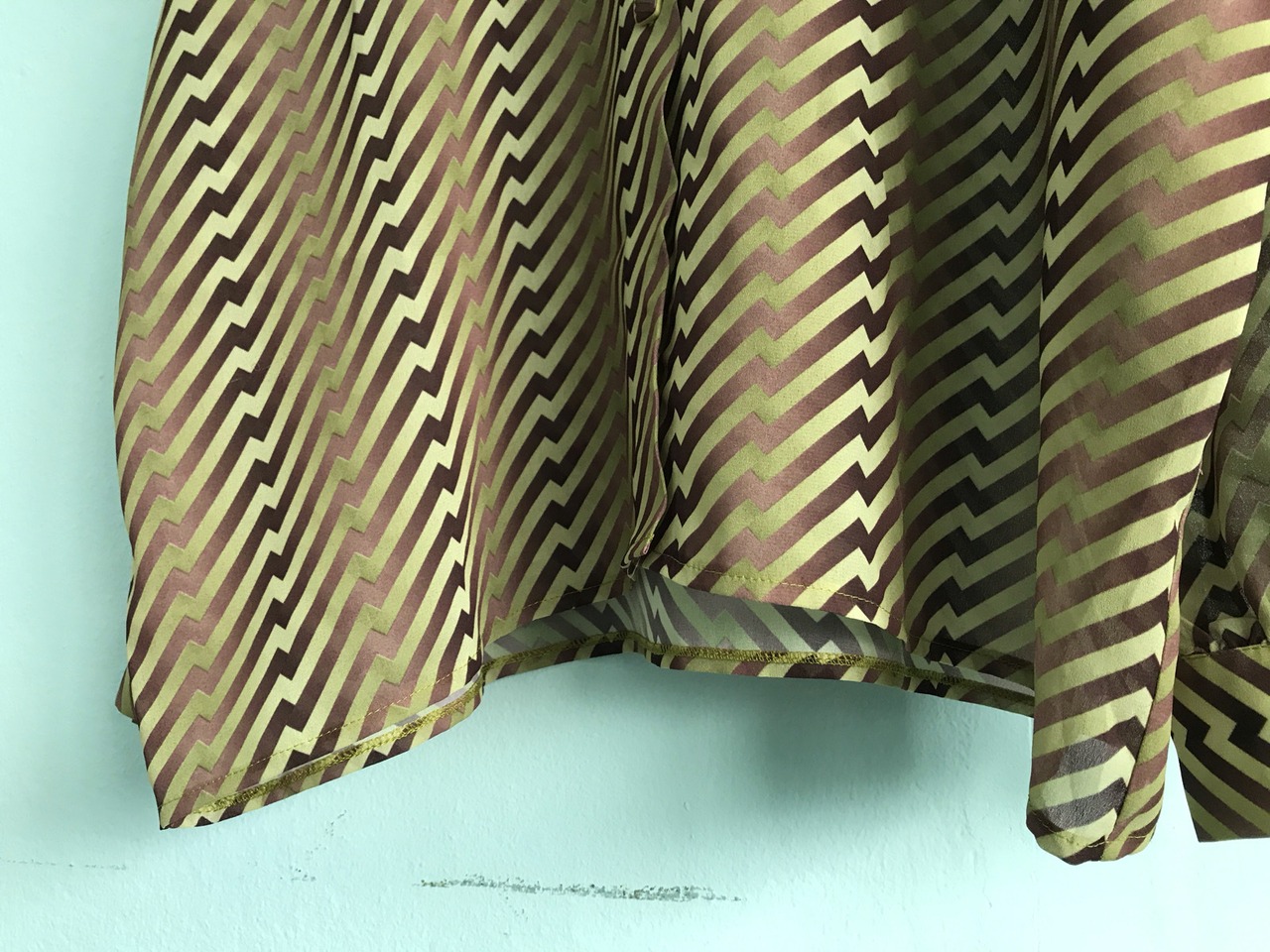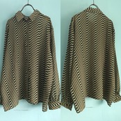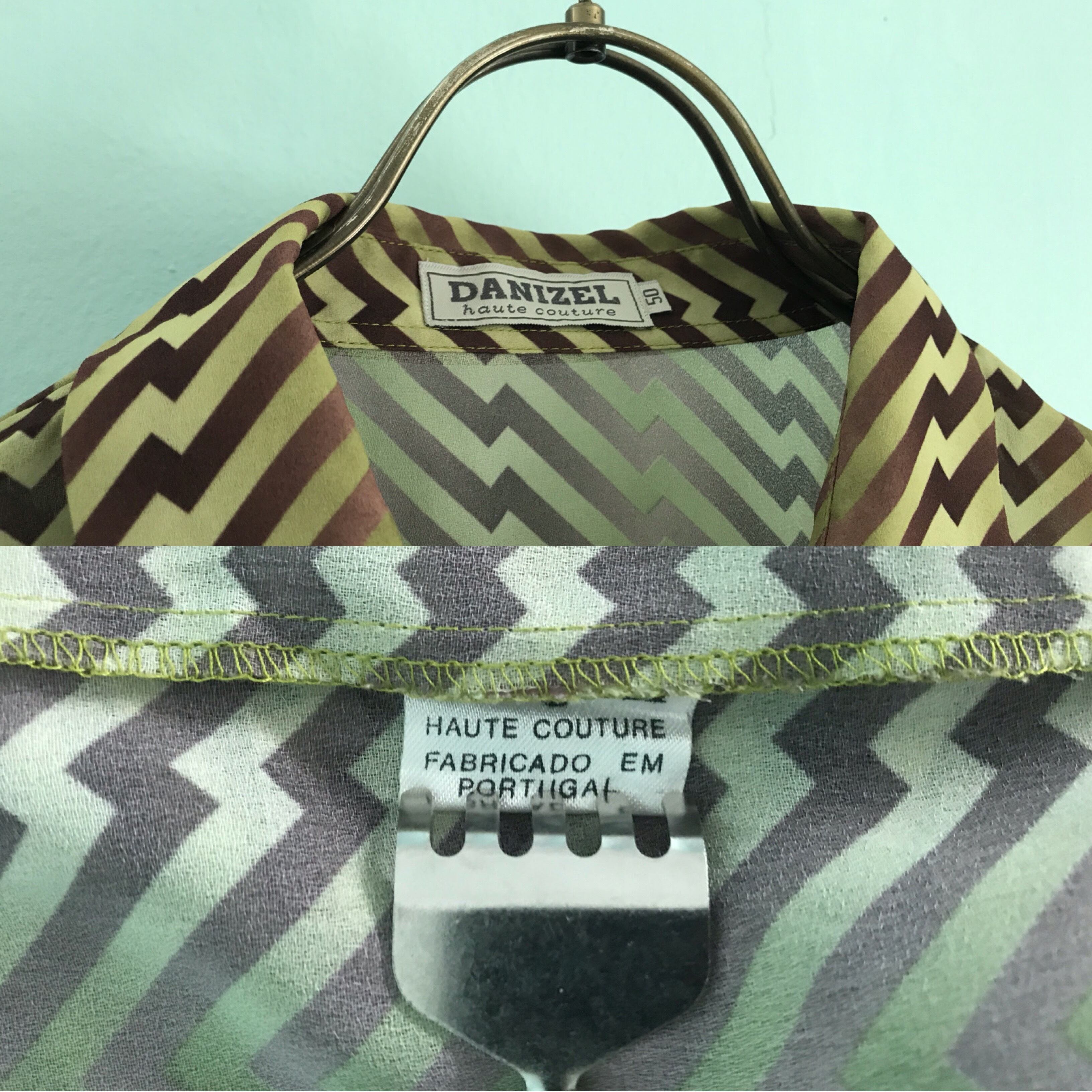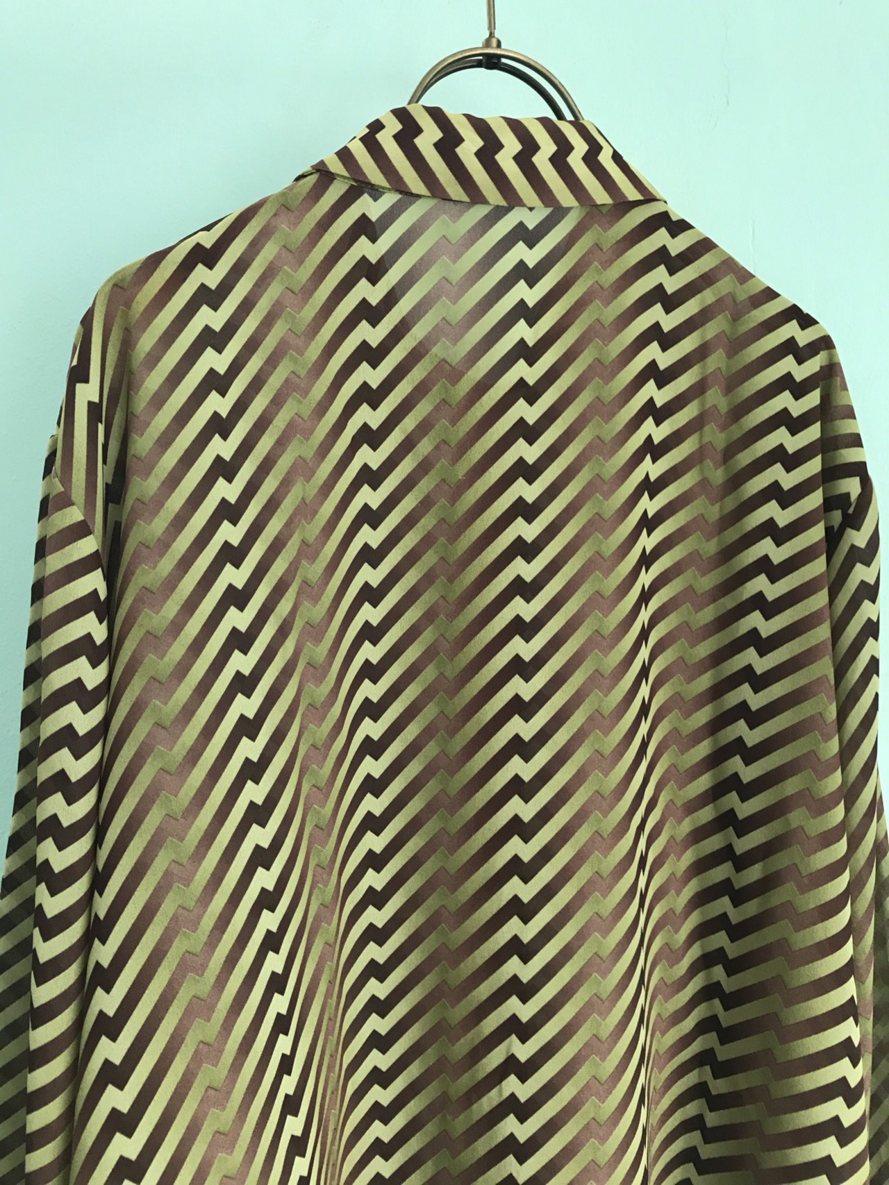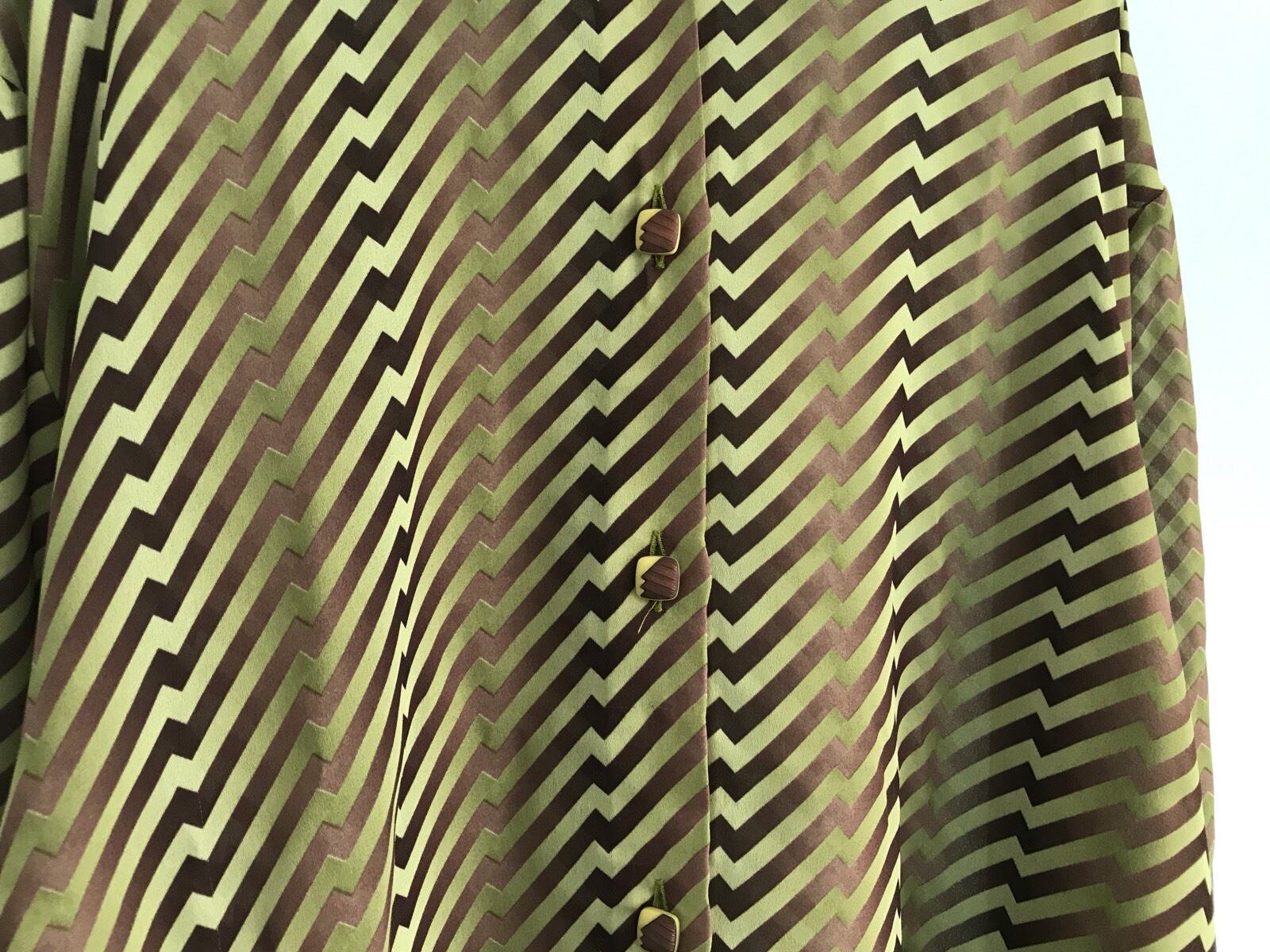 【 ユーロ 古着 ★ オートクチュール 】artistic border long sleeve see through green haute couture shirt / EURO used clothing | ポルトガル製 シースルー 透け感 アート柄 ライン柄 ボーダー 柄シャツ 長袖 緑 ダークブラウン 系 ゆったり レディース XL ブラウス トップス 90s 原宿
