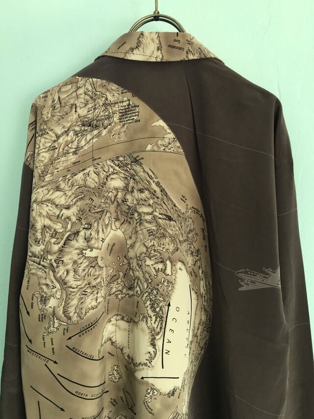 ワールドトラベル柄 ★ 日本製古着 美品 】world map pattern around the world long sleeve shirt - made in JAPAN, used / 旅行柄 世界地図柄 ゆったり 総柄シャツ 長袖シャツブラウン ベージュ系 レディース フリー ブラウス トップス オーバーサイズ 90s ヴィンテージ 原宿 秋物