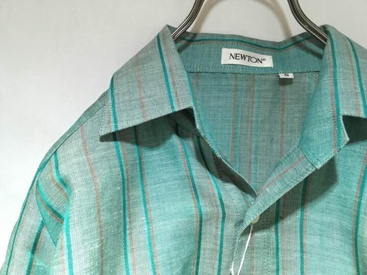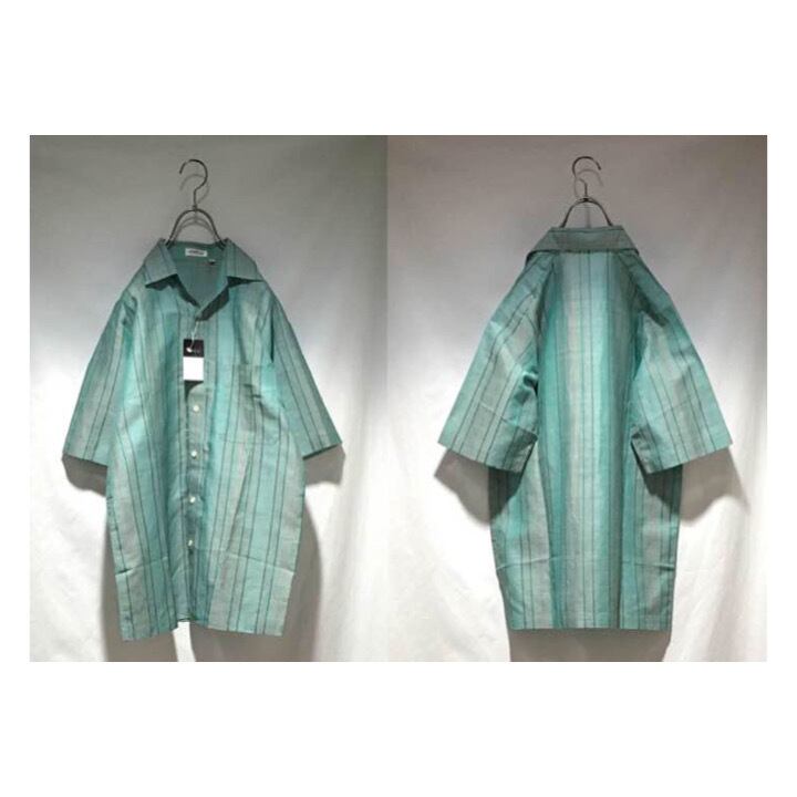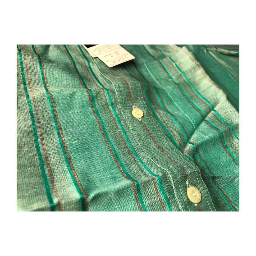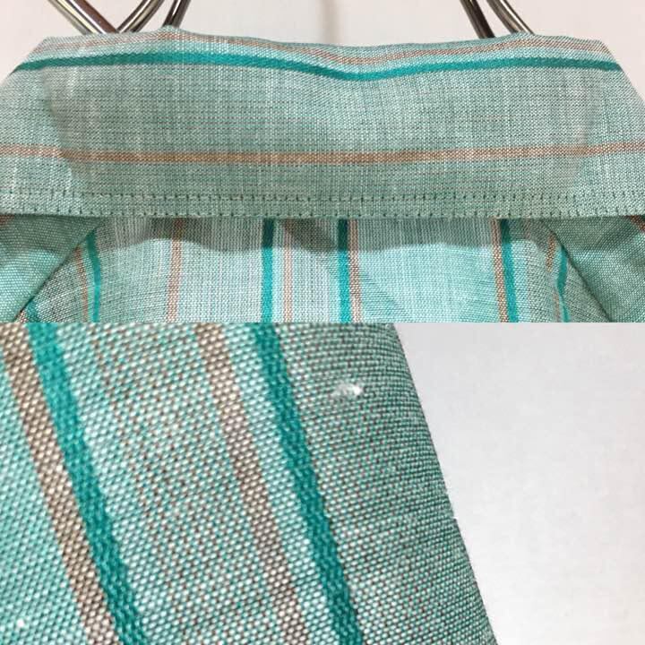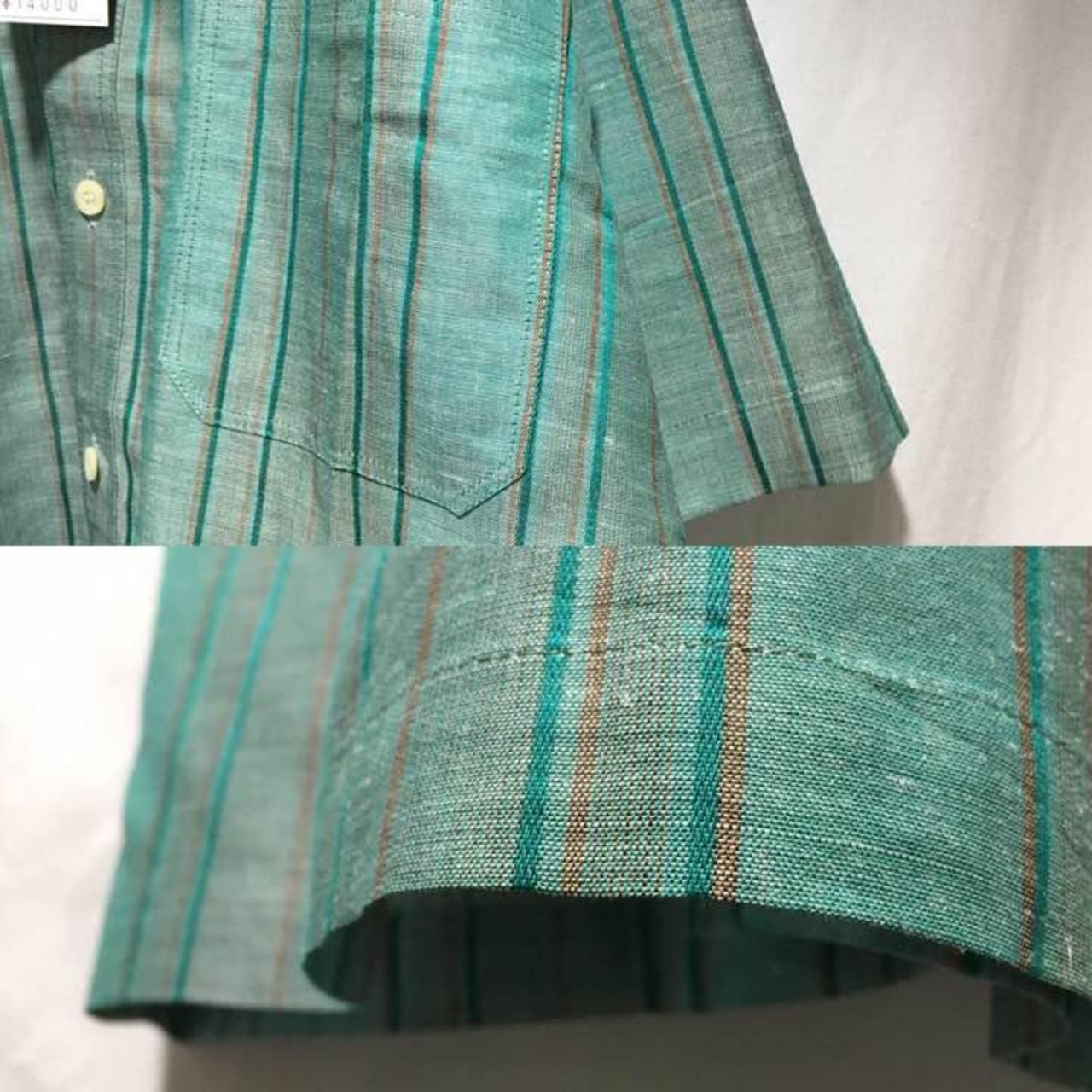 hemp green stripe pattern shirt, mens, used, dead stock デッドストック 未使用品 日本製 ヴィンテージ古着 ストライプ 総柄 開襟シャツ 柄シャツ 透け感 半袖シャツ 緑 メンズ L前後 トップス 90年代