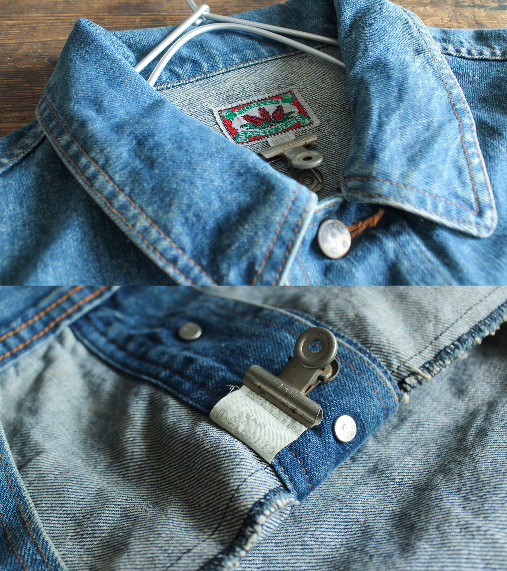 両袖とバックに汚れがあります。年代物につき、それなりに着用感がありますが、タフなデニムでまだまだお楽しみいただけます。