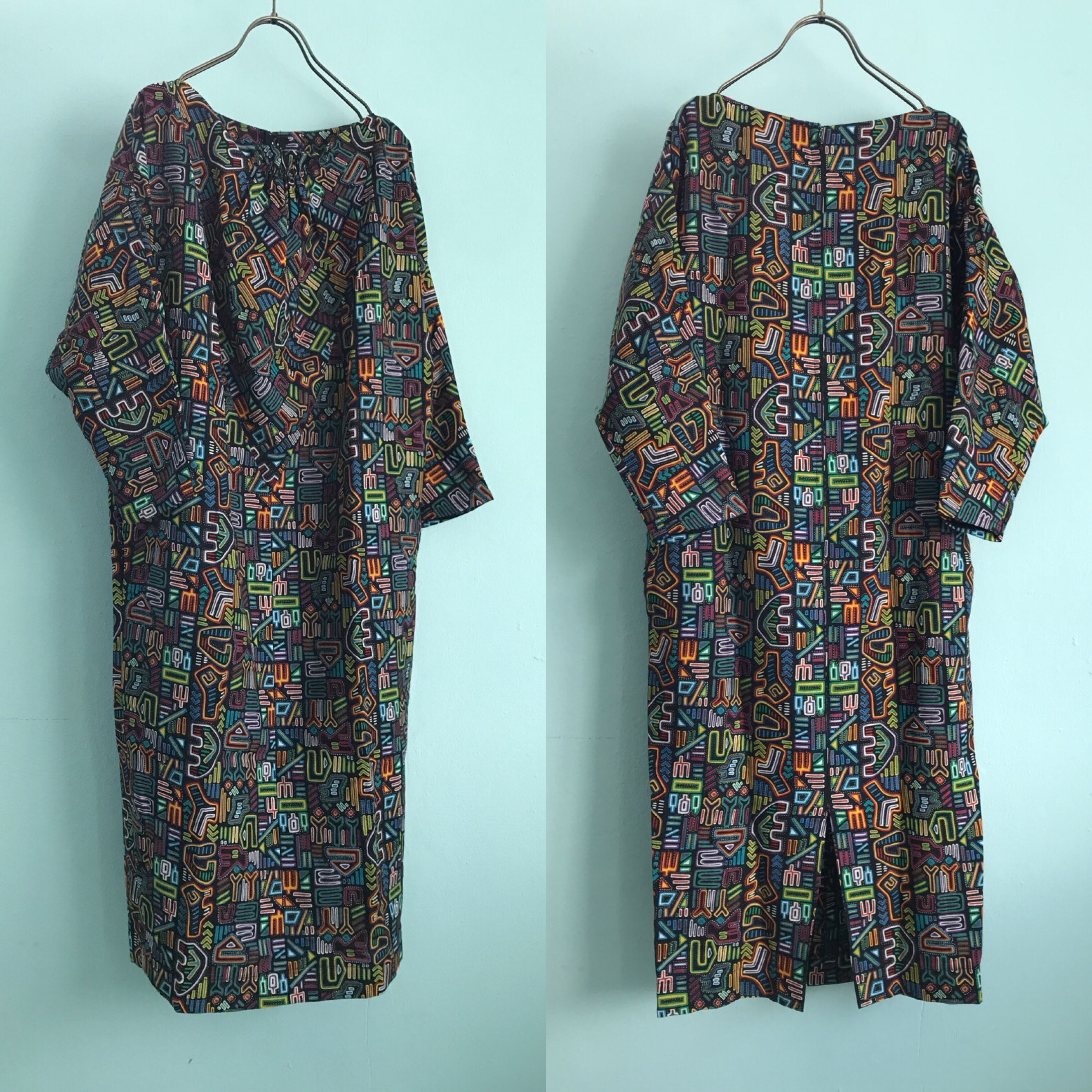 【 デッドストック 古着 ★ サイバーパンク ワンピース 】 dead stock cyberpunks long sleeve dress / 極美品 ネオンサイケ柄 総柄 ドルマンスリーブ セミロング ひざ丈 ドレス 半端袖 半袖 長袖 黒 カラフル 着丈100-110 レディース S XS かわいい フェス