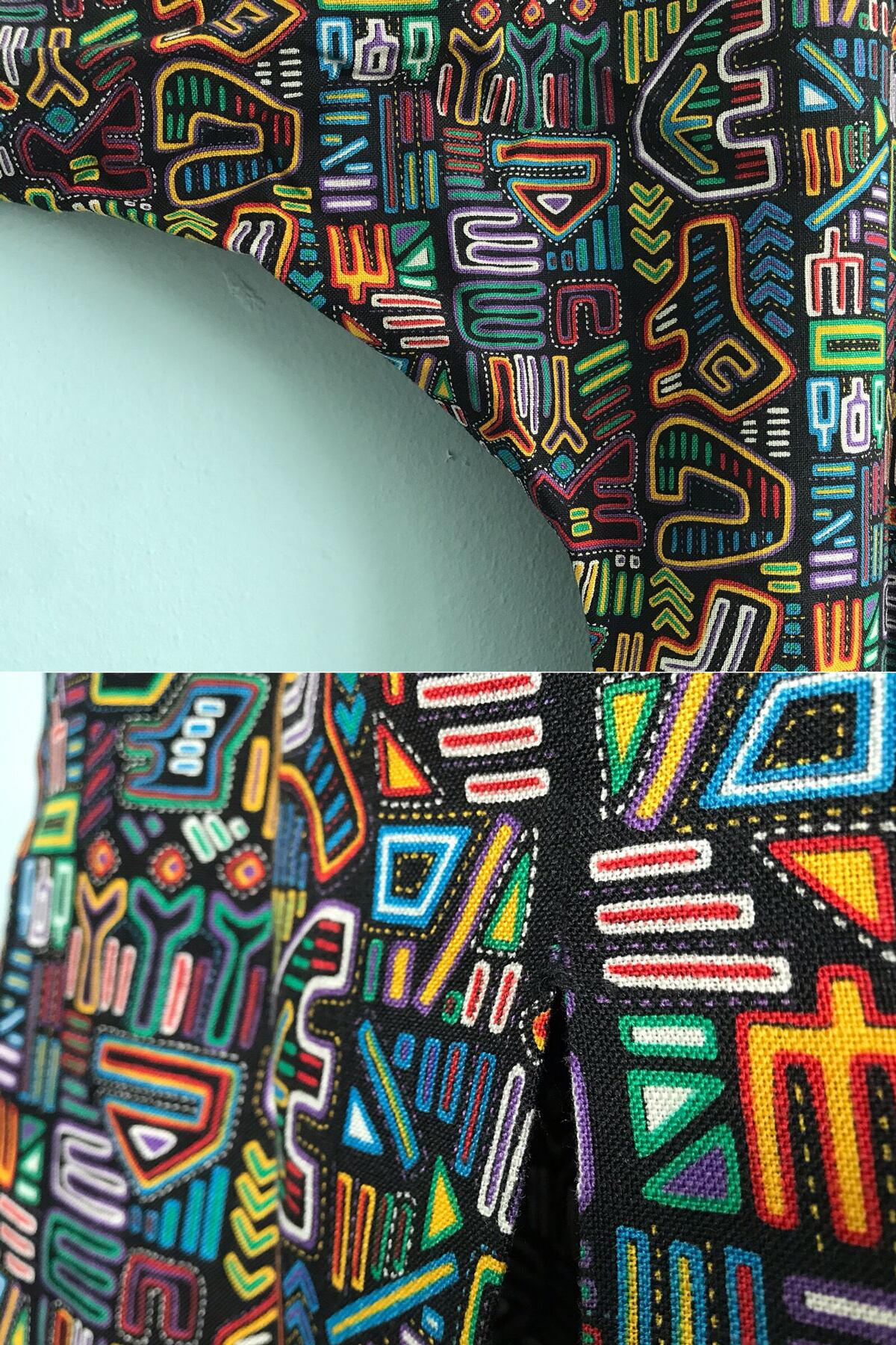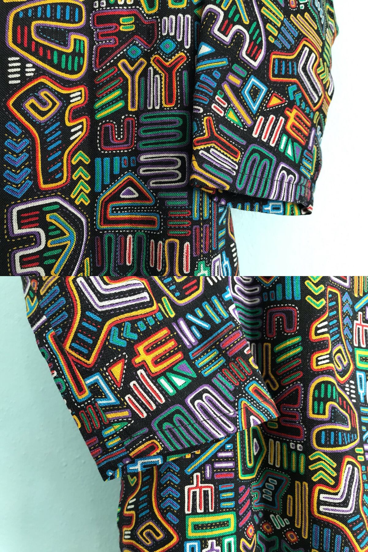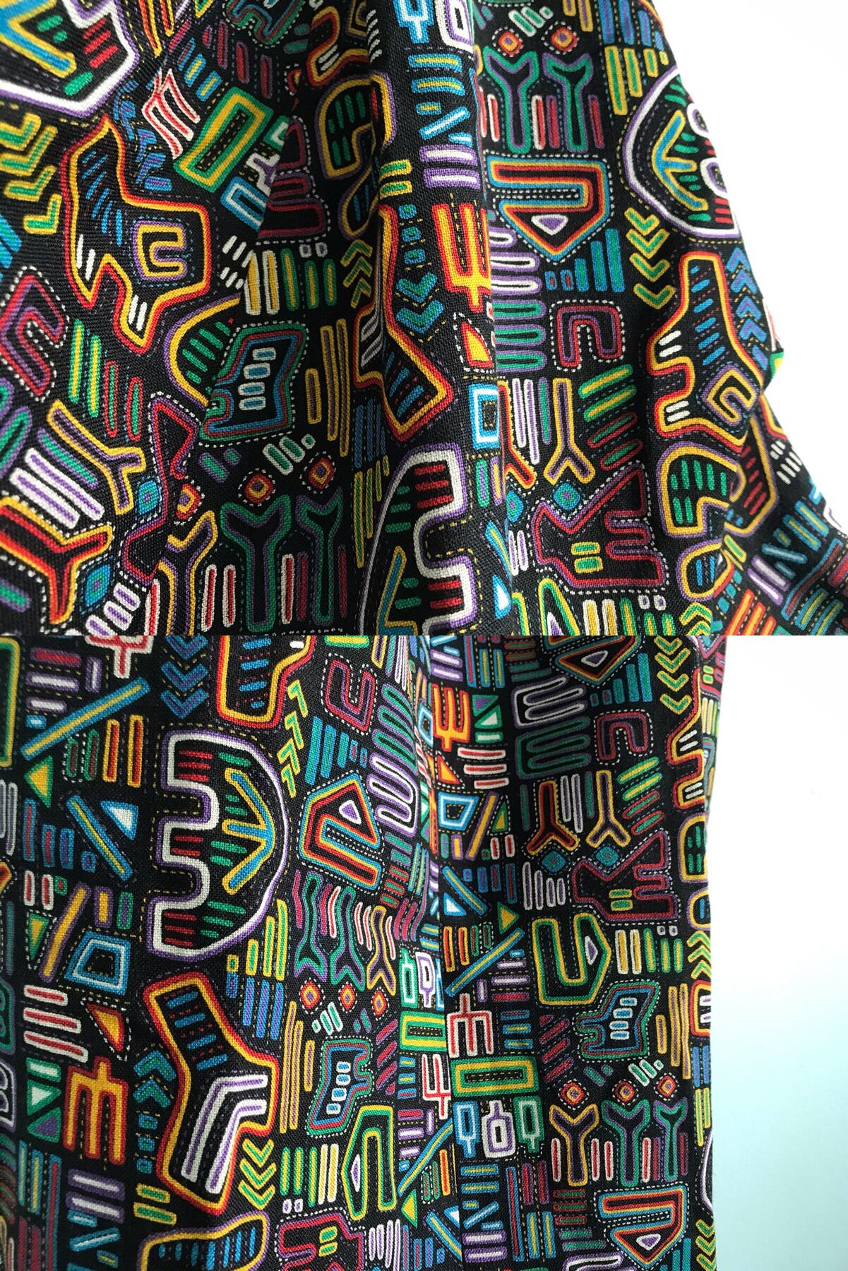 【 デッドストック 古着 ★ サイバーパンク ワンピース 】dead stock neon pattern cyberpunks long sleeve one piece vivid dress / 極美品 ネオン柄 サイケ柄 音楽柄 総柄 ドルマンスリーブ セミロング ひざ丈 ボックス ドレス アンプル サックライン 半端袖 長袖 黒 カラフル 着丈100 - 110 レディース S XS かわいい フェス