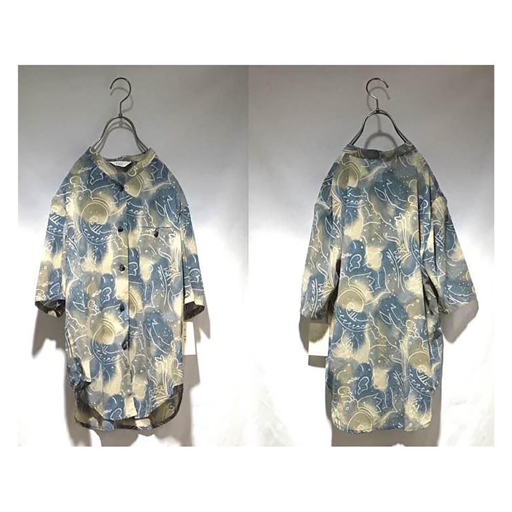 タグ付きのデッドストック(新古品)。ペイズリーのような雰囲気の総柄マオカラーシャツです。勾玉が描かれた、天空を翔ぶようなロマンティックな世界観です。