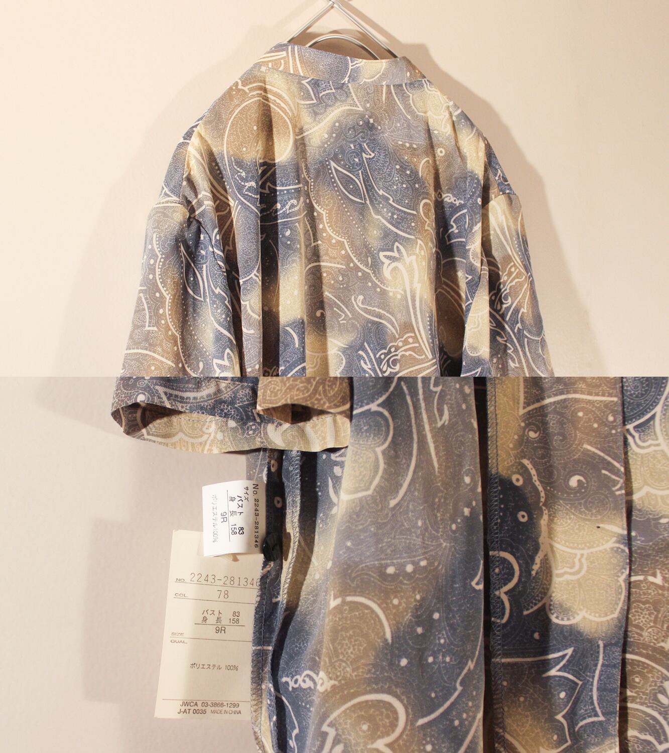 Japan dead stock - paisley like pattern light blue shirt / ladies, used 【 タグ付き 未使用品 ★ 日本古着 】 デッドストック 新古品 ペイズリー柄 天空 勾玉 総柄 スタンドカラー マオカラーシャツ ブラウス 半端 半袖 五分 ライトブルー レディース 9R S-M かわいい ロマン 宇宙