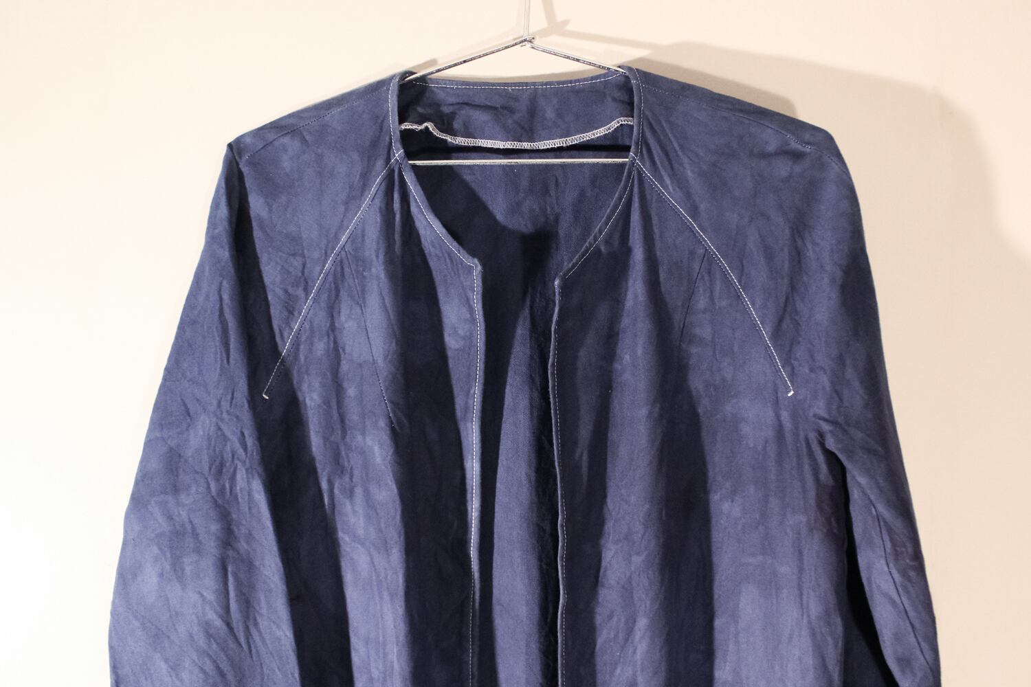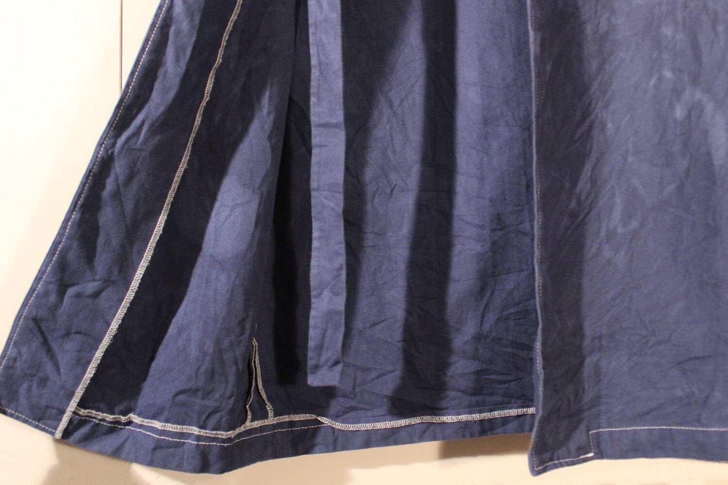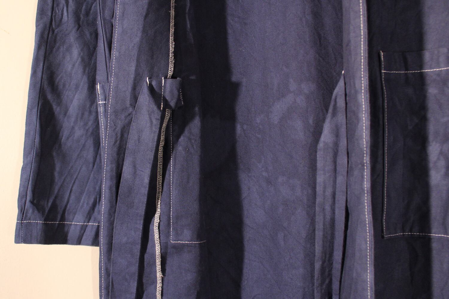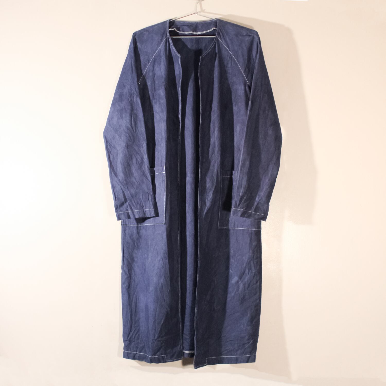 【 国籍不明 古着 ★ ロング丈 】 denim like long gown coat cardigan / vintage, mens, used - コットンツイル 染め ガウン ロングカーディガン デニムシャツ 羽織り ノーカラー 長袖 青 藍色 紺色 タイト メンズ S 原宿 ヴィンテージ