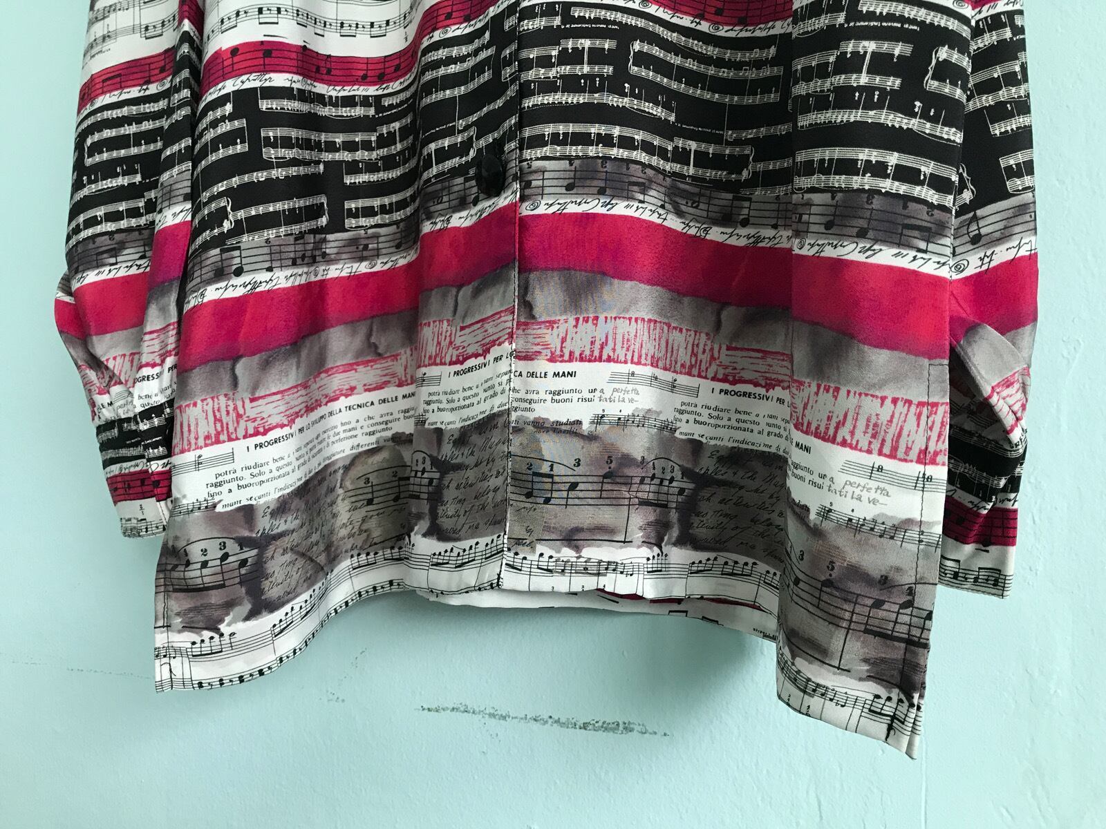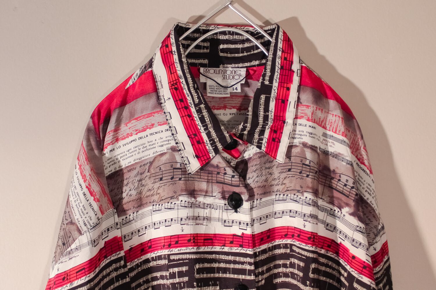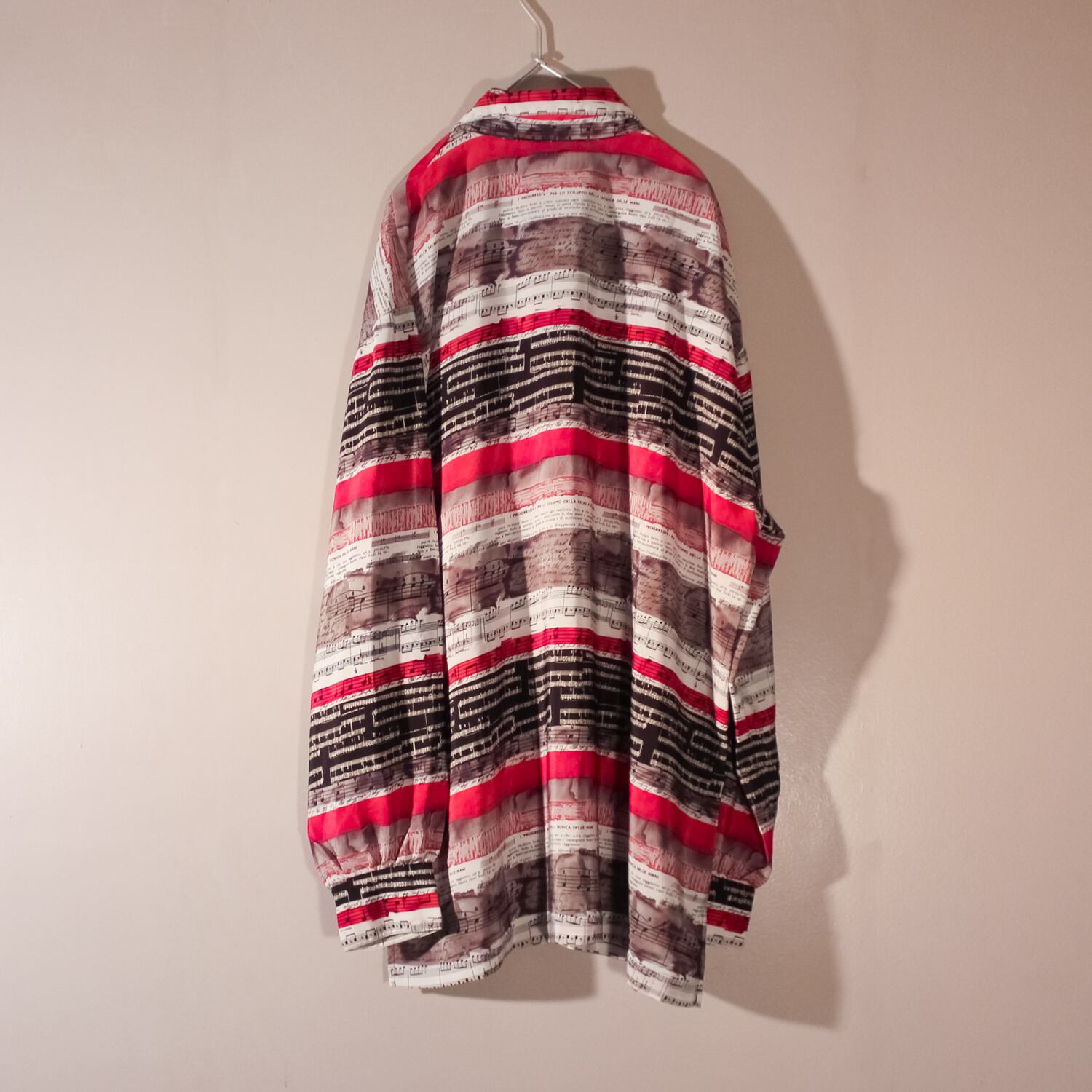 【 USA古着 ★ 音楽柄 】 90s music pattern long sleeve USA vintage shirt / 美品 マルチボーダー 総柄シャツ 長袖 白 赤 レディース XL ブラウス トップス ゆったり オーバーサイズ ヴィンテージ クラシック 楽譜 メンズ 原宿