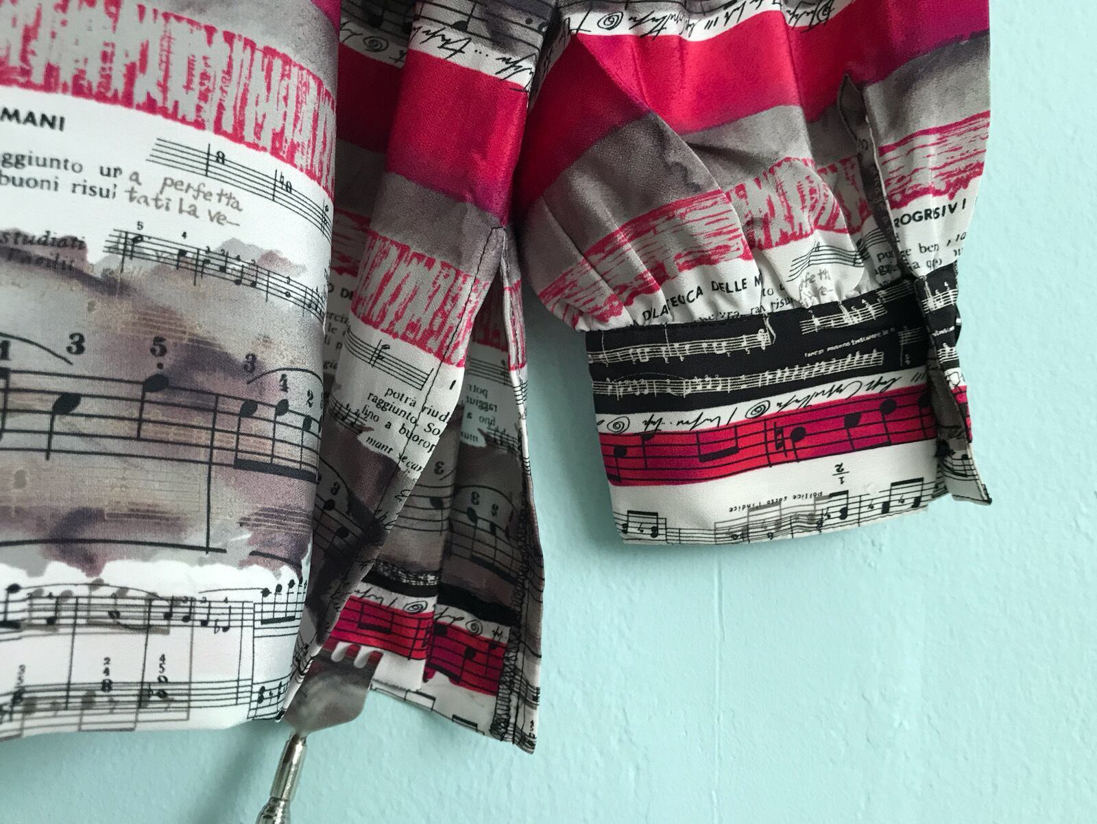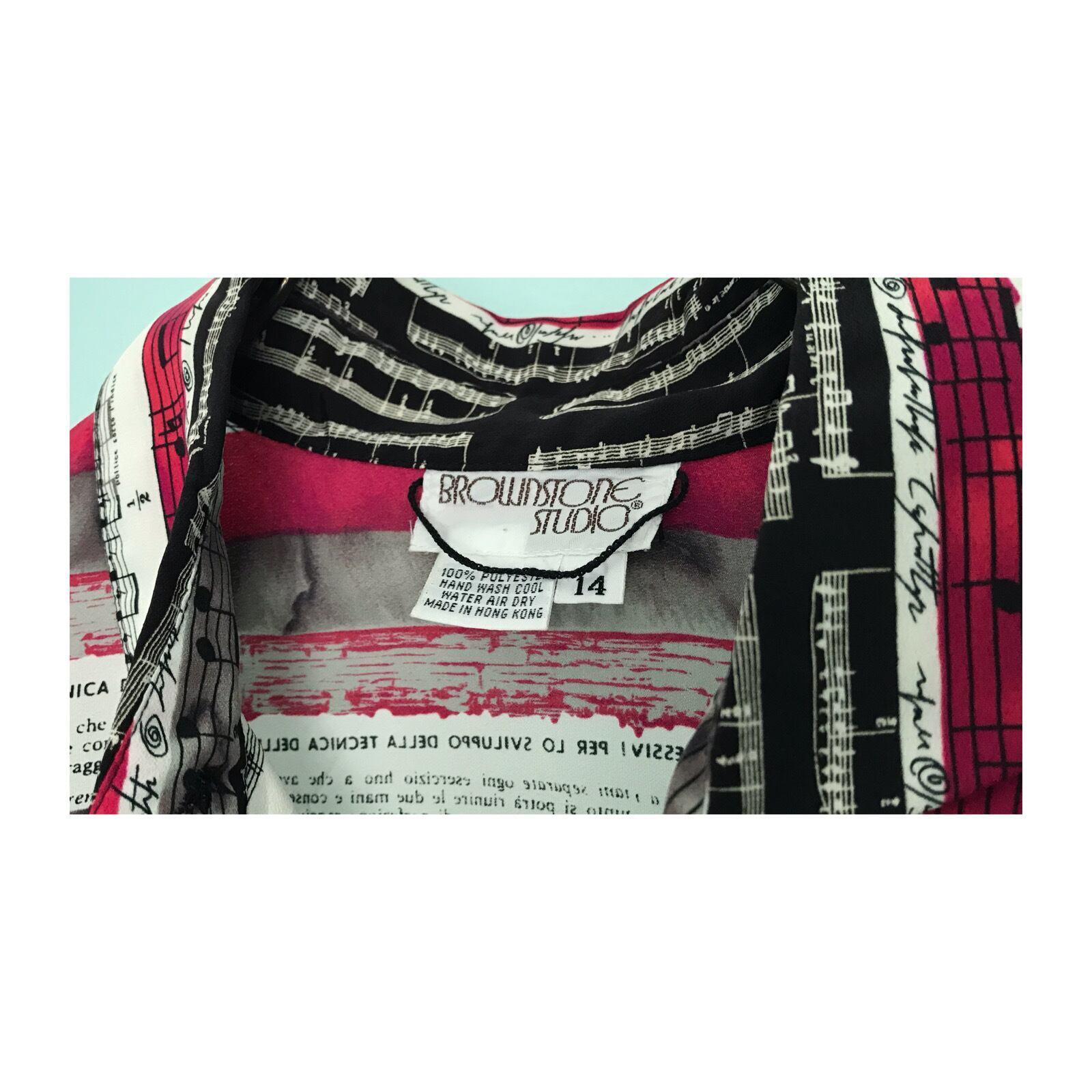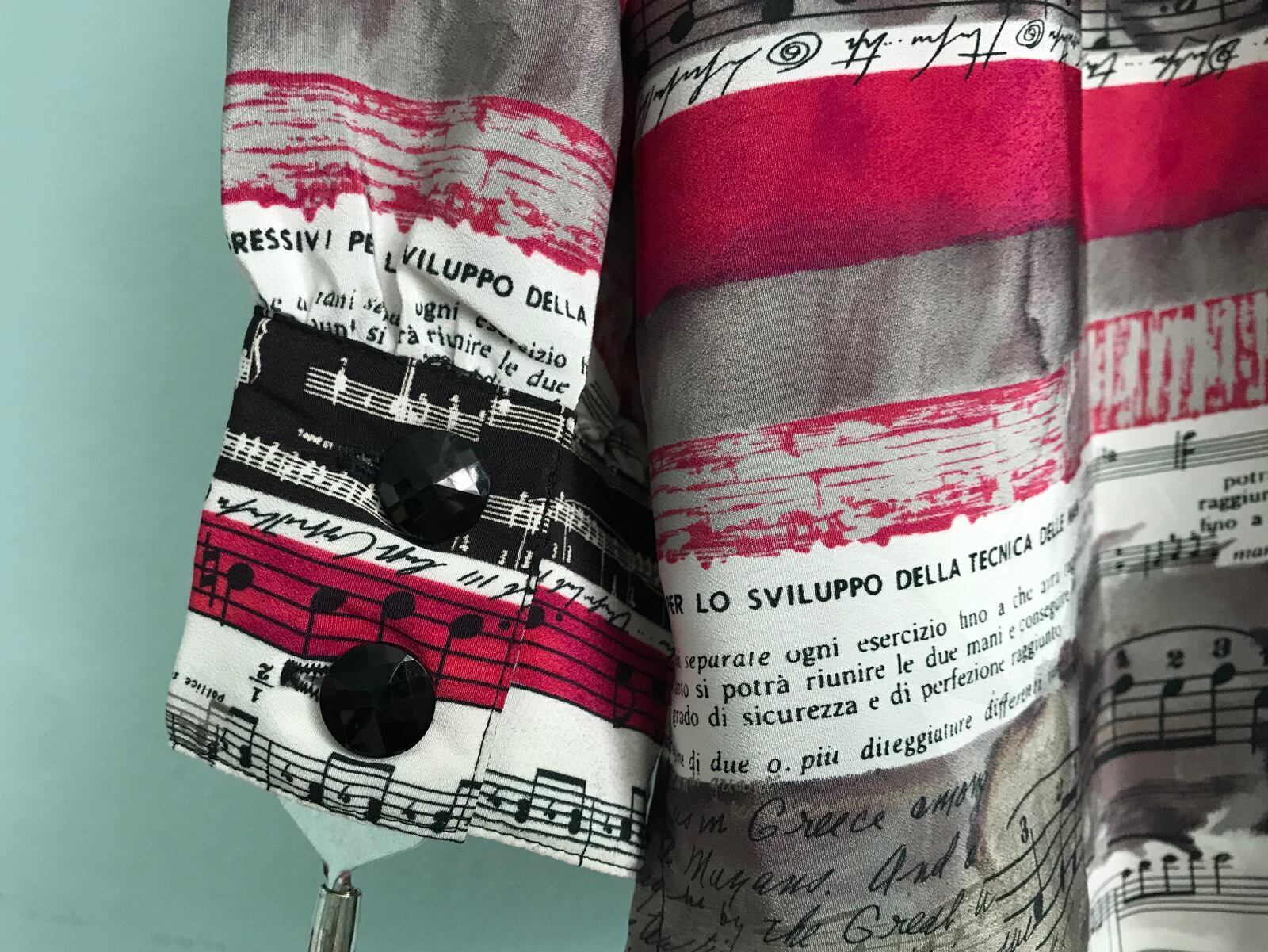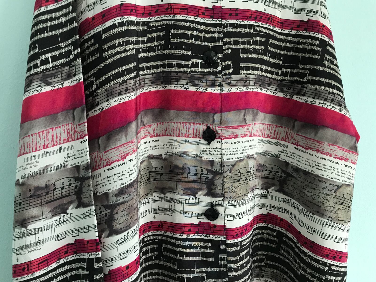 【 USA古着 ★ 音楽柄 】 90s music pattern long sleeve USA vintage shirt / 美品 マルチボーダー 総柄シャツ 長袖 白 赤 レディース XL ブラウス トップス ゆったり オーバーサイズ ヴィンテージ クラシック 楽譜 メンズ 原宿