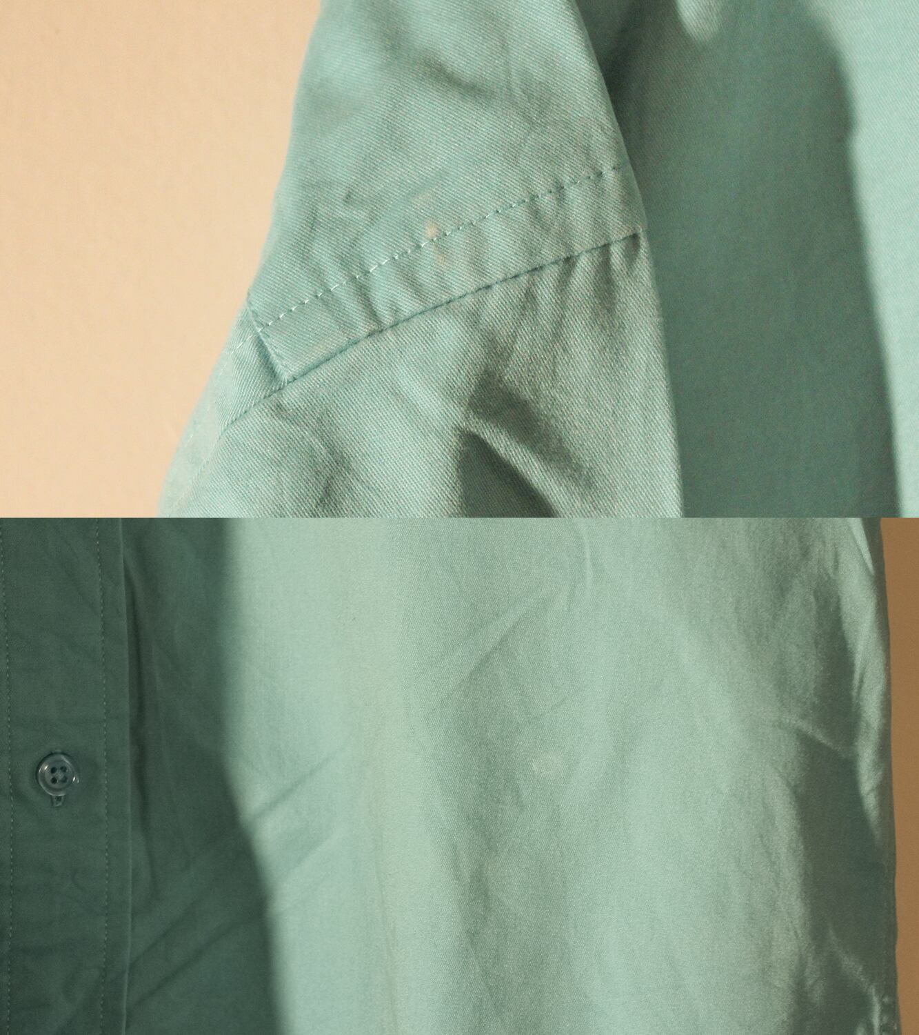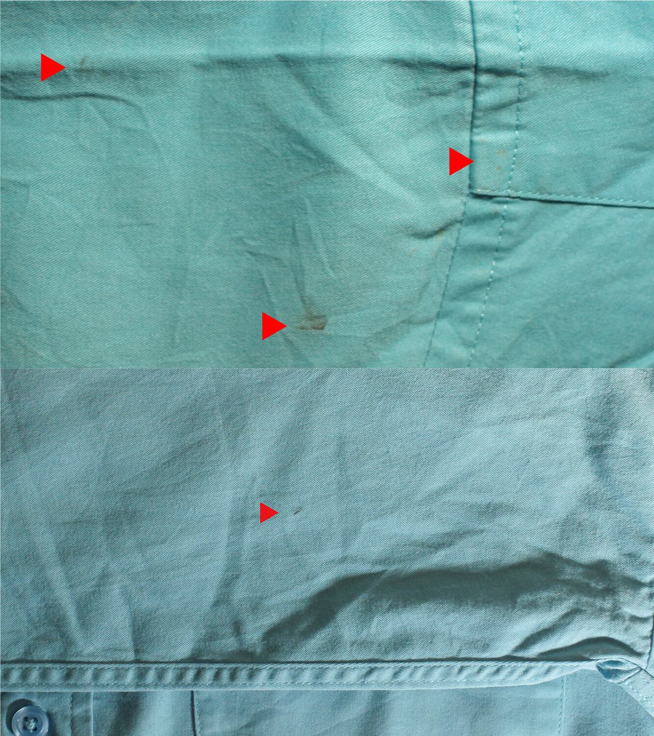 肉眼や室内だかなり分かりにくいですが、フロント右側下部辺りをよーく見ると非常に目立たない薄っすらとしたシミ(黄ばみ感)があります。写真での再現が困難なレベルの汚れです。