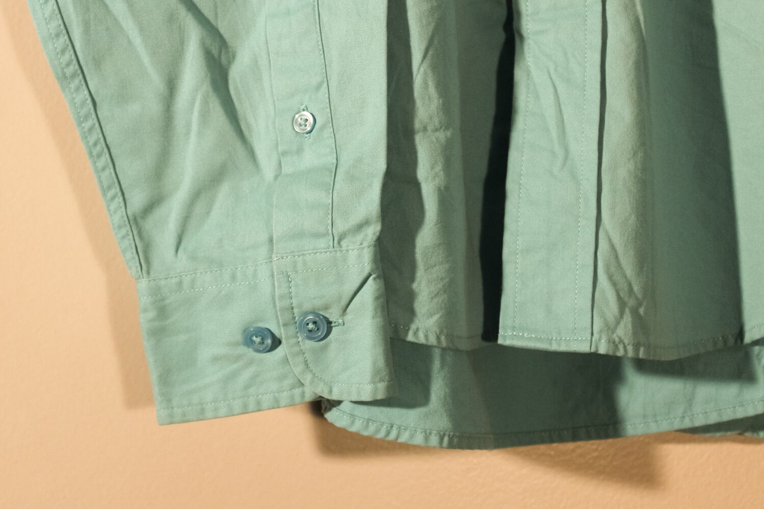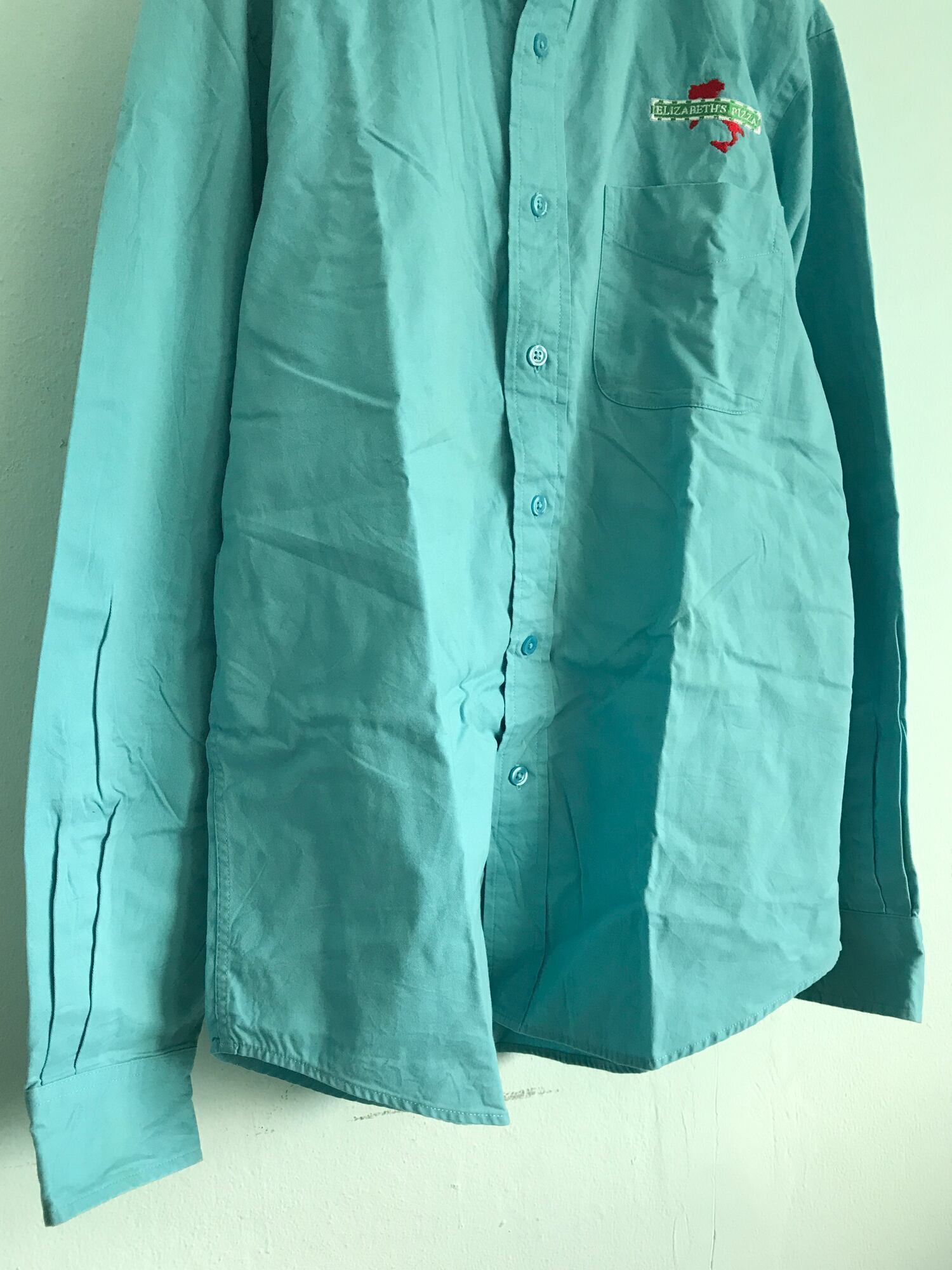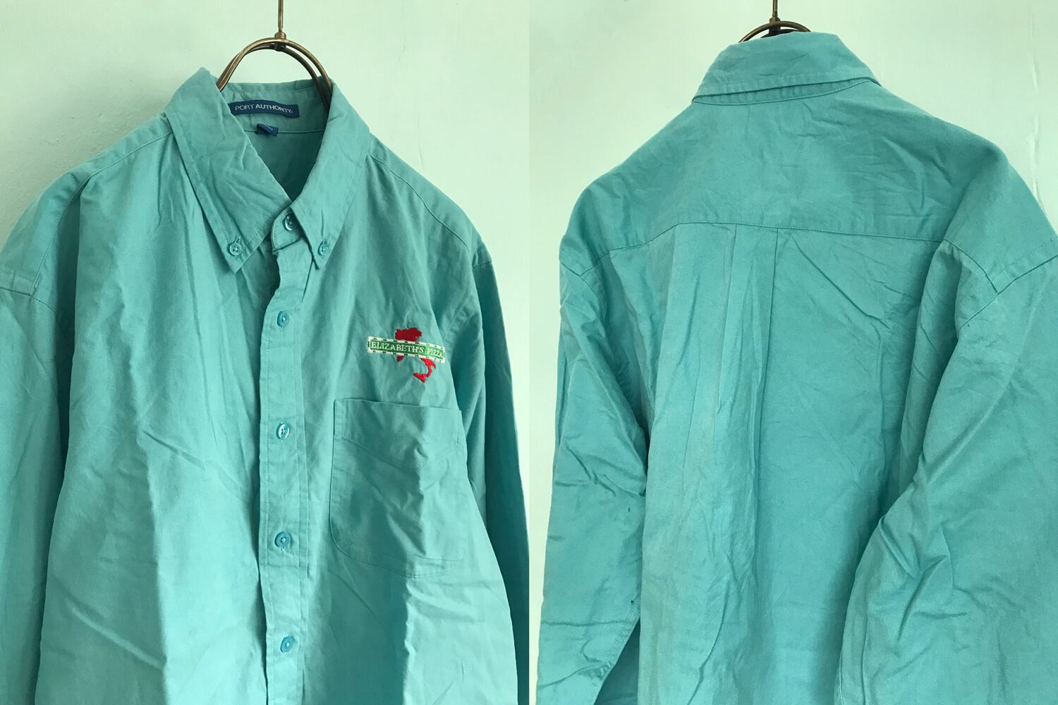 アメリカのイタリアンピザ屋さん「エリザベスピザ」の刺繍ロゴが入った長袖BDシャツ。エメラルド色。サイズ感はL程度ですが、必ず実寸を確認してください。