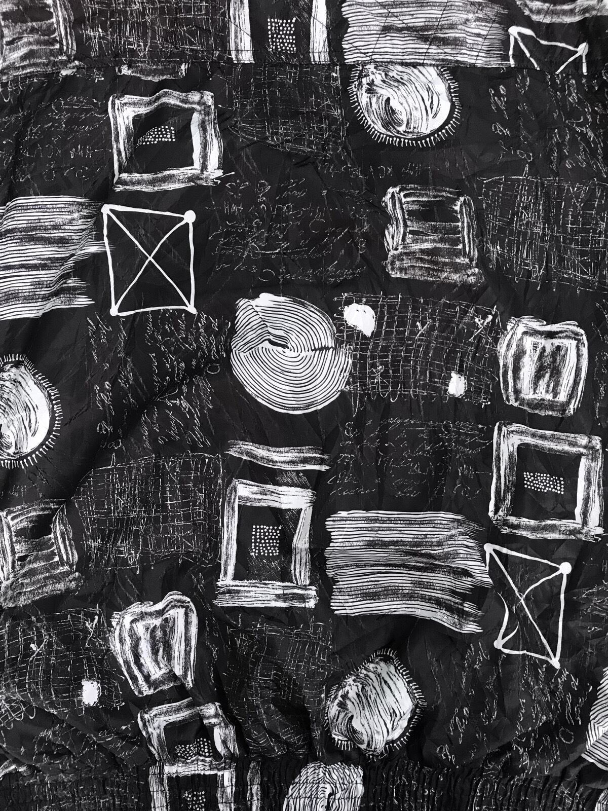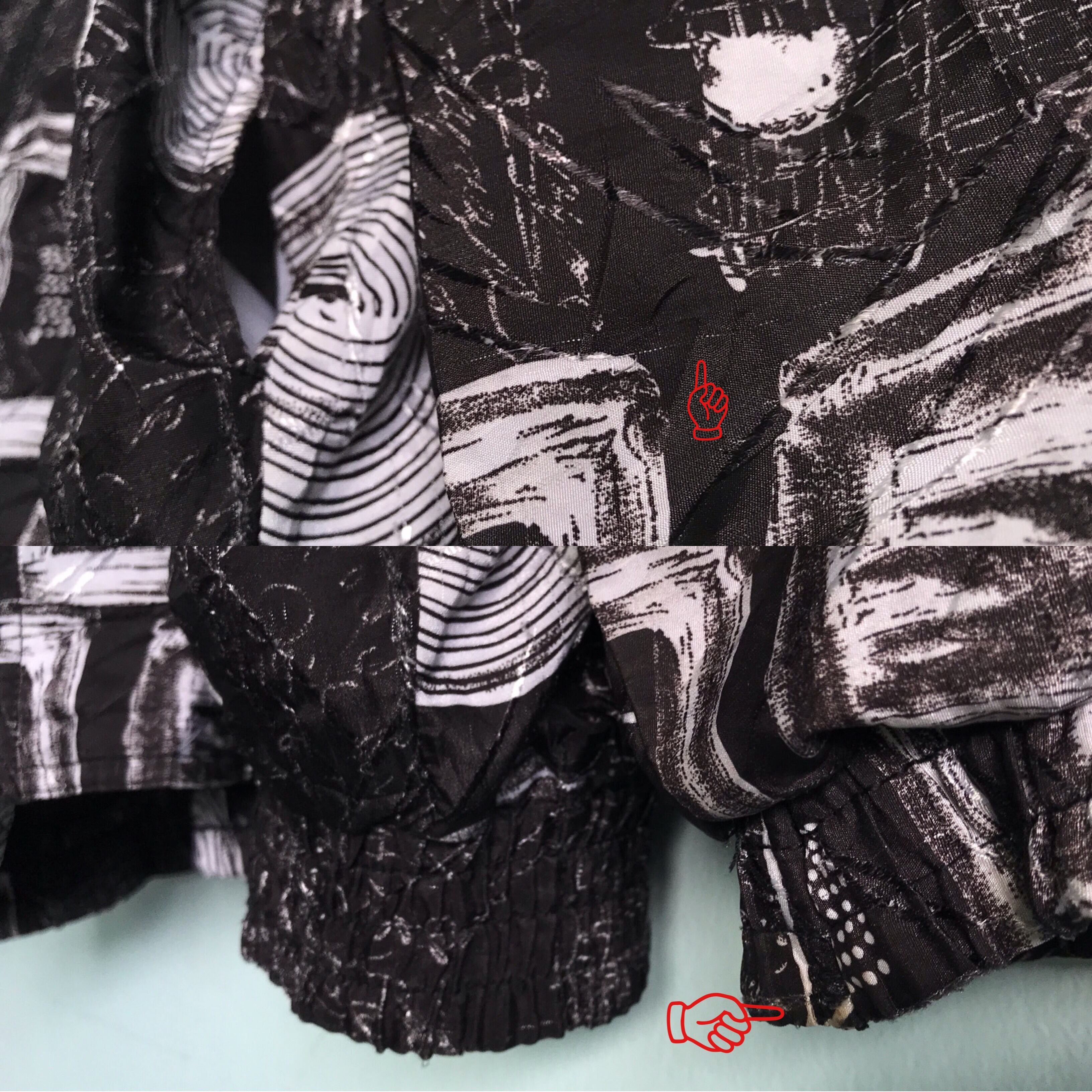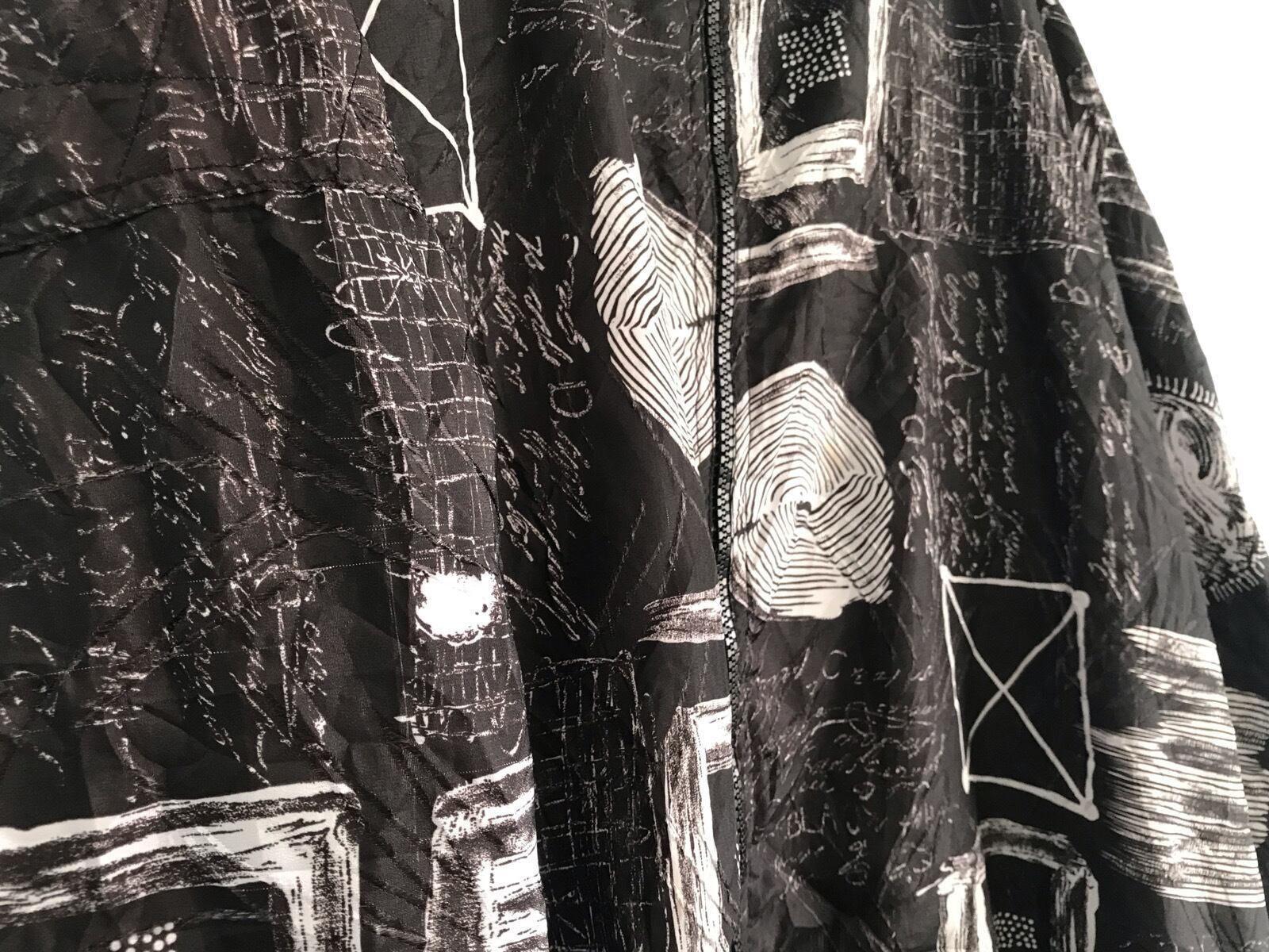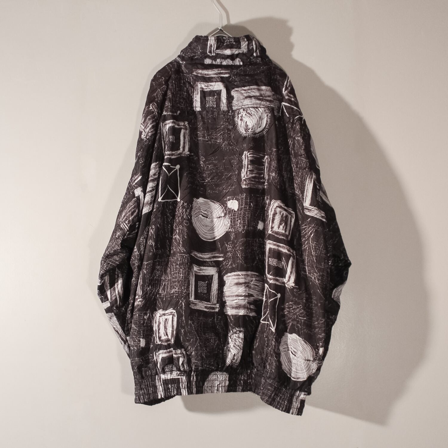 USAヴィンテージのオーバーサイズブルゾンジャケット。ナイロンジャケット形状で、ポリエステル製です。幾何学図形が散りばめられ、英語や数式や文字列のようなものの総柄。研究者が宇宙の物理法則の謎解きをしているようなイメージで、数学者やデータサイエンス、統計、微積分好きにおすすめです。年代相応、小傷スレ汚れがあります。