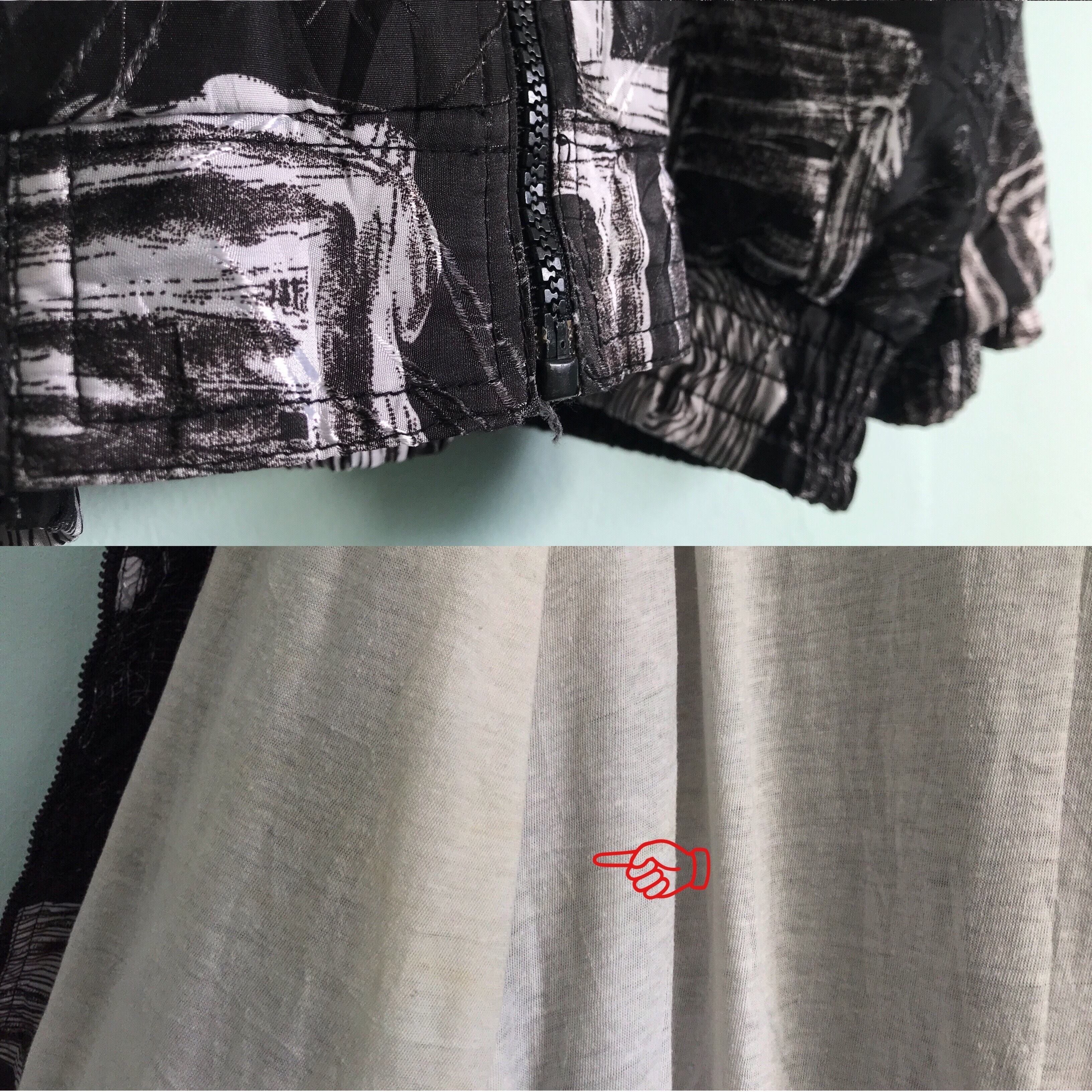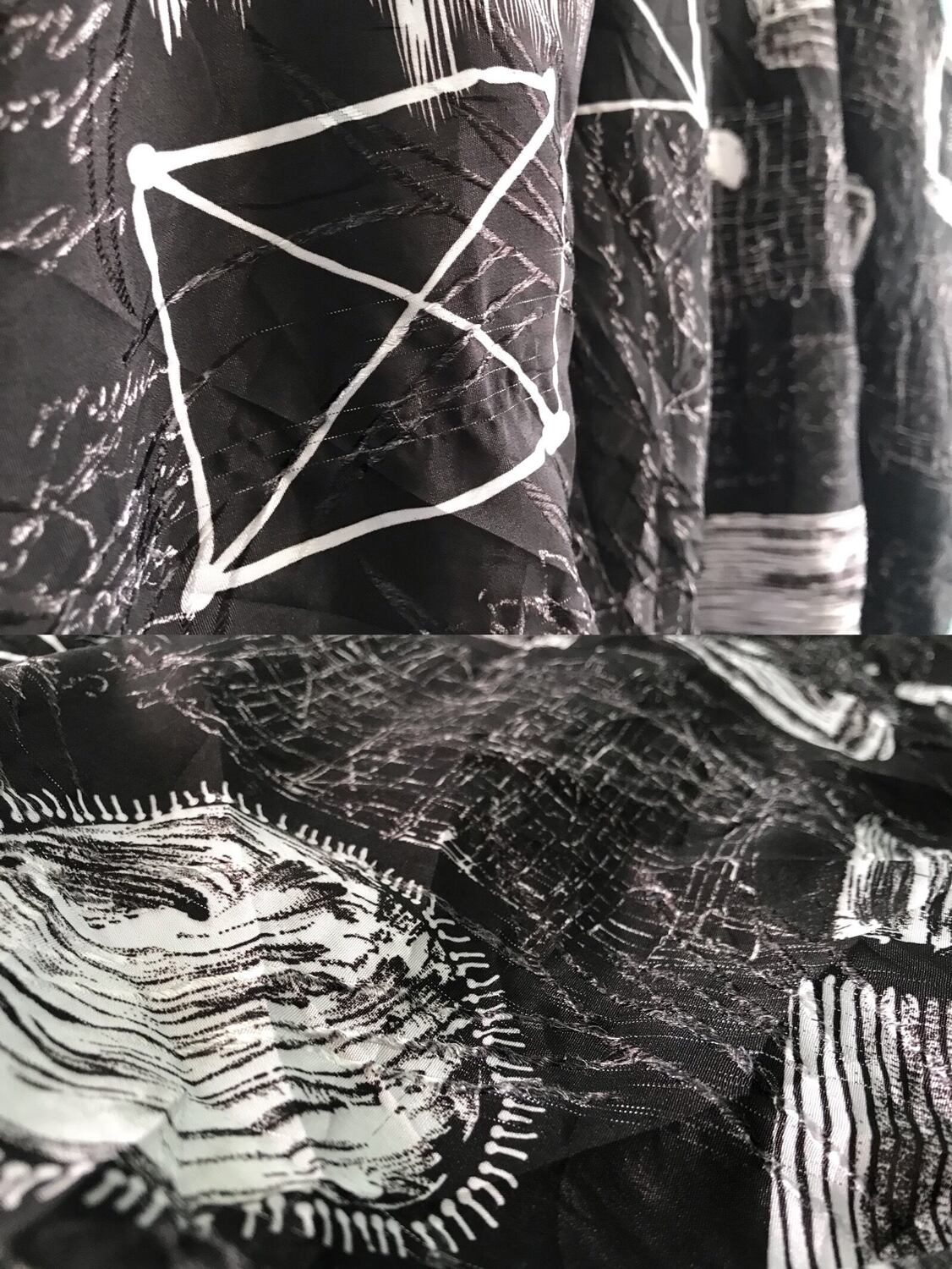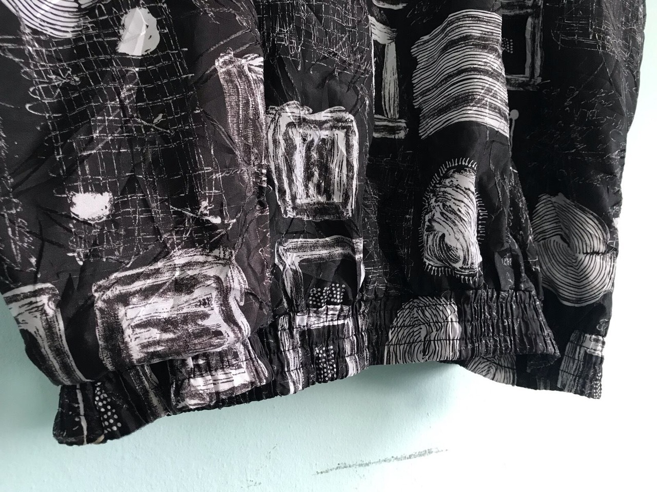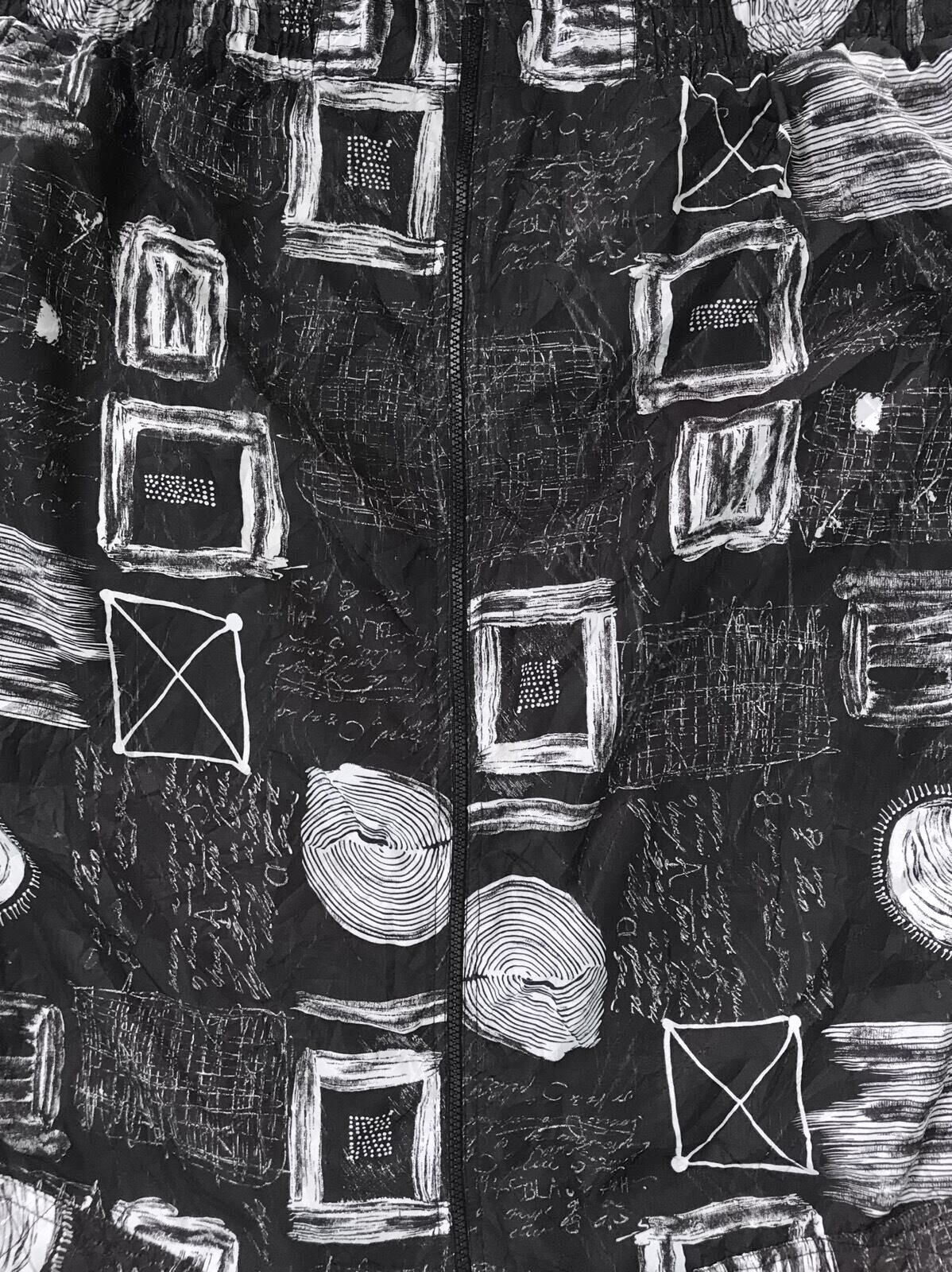 USAヴィンテージのオーバーサイズブルゾンジャケット。ナイロンジャケット形状で、ポリエステル製です。幾何学図形が散りばめられ、英語や数式や文字列のようなものの総柄。研究者が宇宙の物理法則の謎解きをしているようなイメージで、数学者やデータサイエンス、統計、微積分好きにおすすめです。年代相応、小傷スレ汚れがあります。