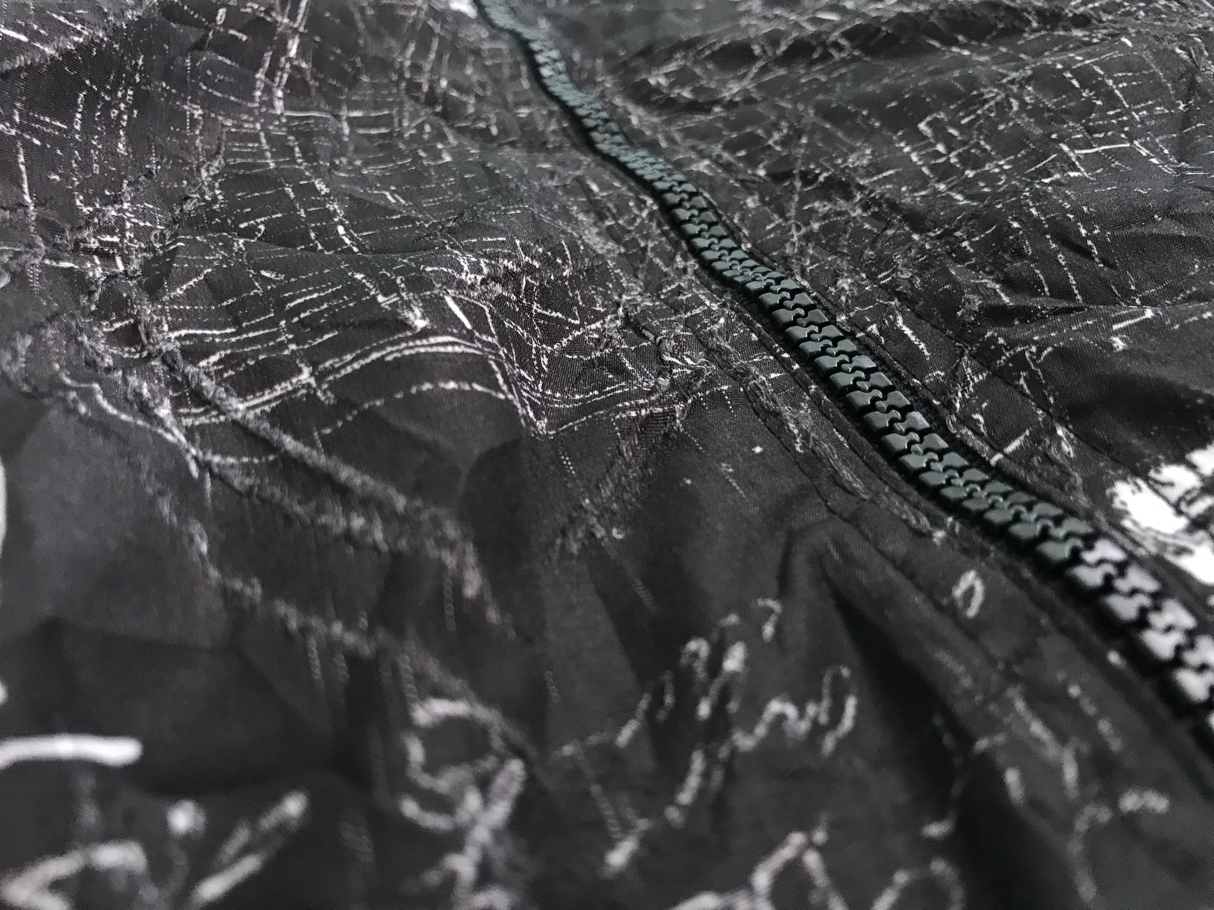 黒の光沢刺繍ラインや白いフリーハンド線はデザインですが、光沢感に混じって白いスクラッチが全体に少なからずあります。