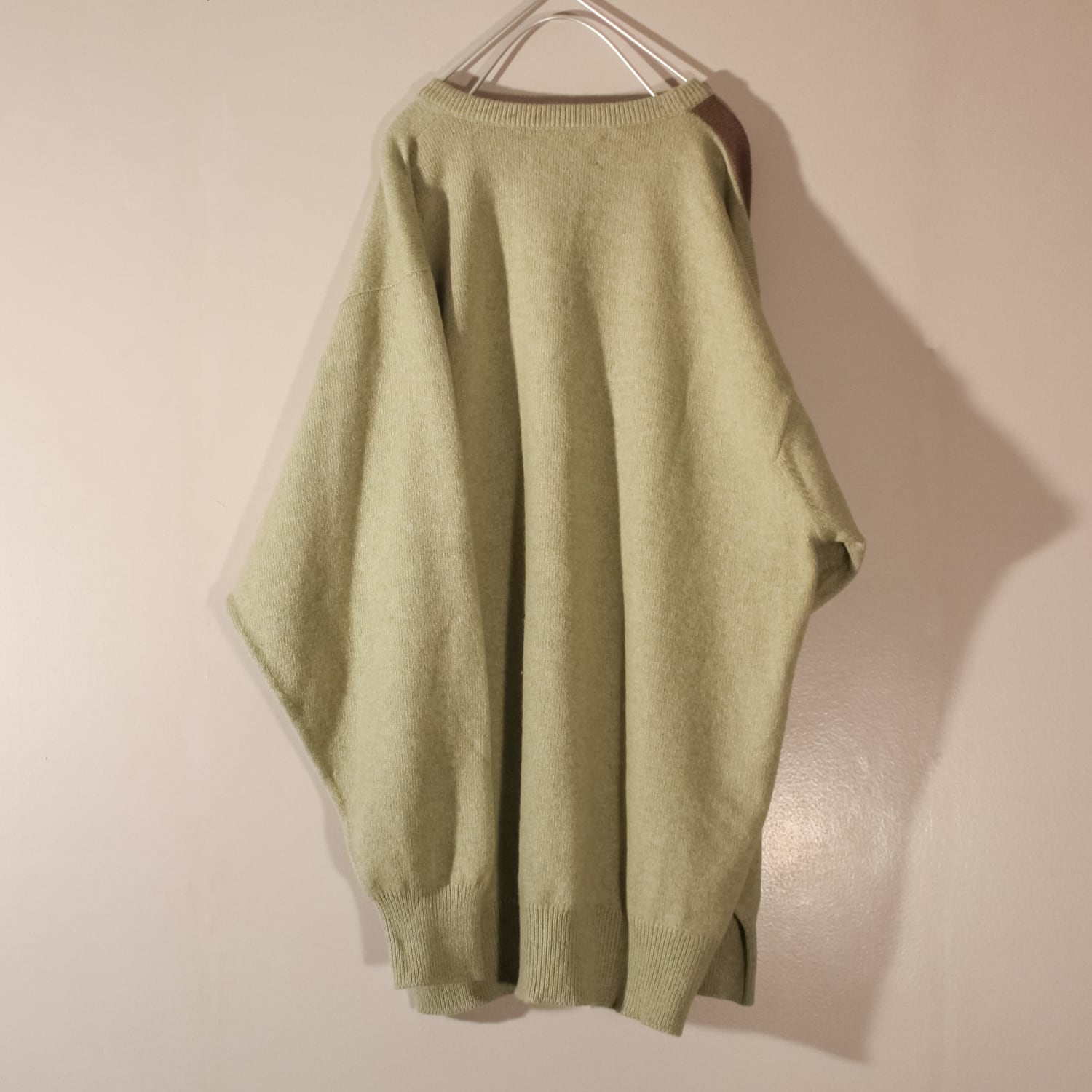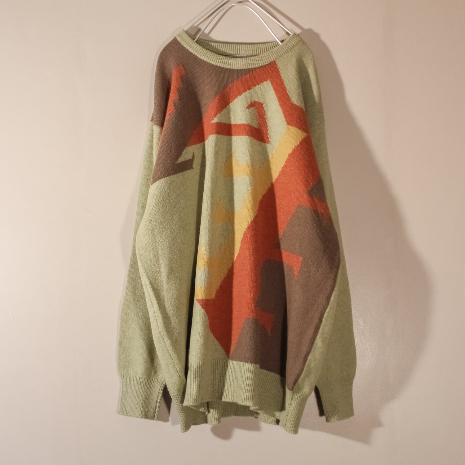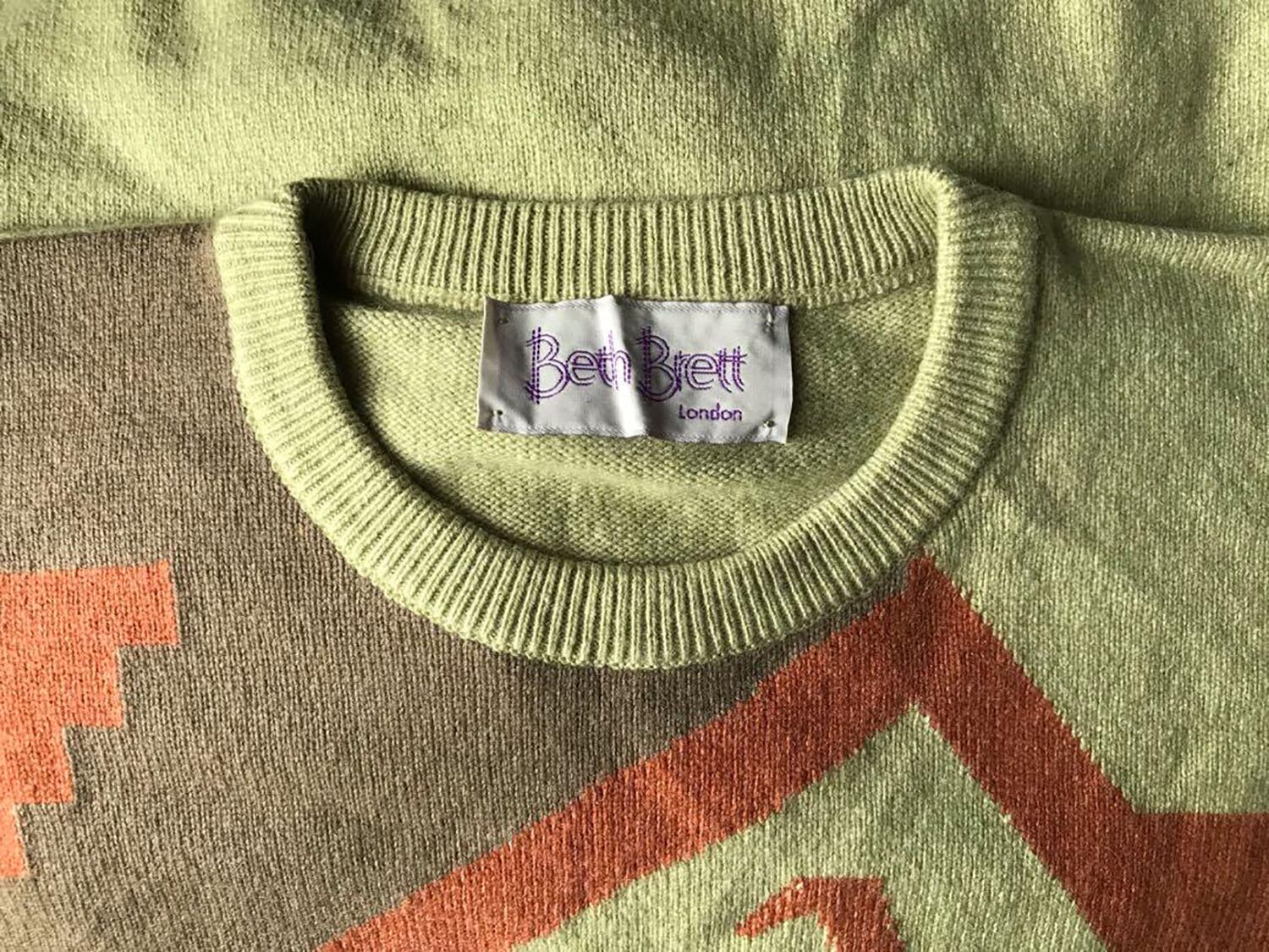 【 英国製 ヴィンテージ古着 ★ 90s Beth Brett 】 Beth Brett HAND INTARSIA vintage art knit / made in Scotland, mens, used - 英国 ハンドインターシャ 総柄 幾何学 アート 高級ニット 長袖 緑 メンズ L XL 銀座 イギリス