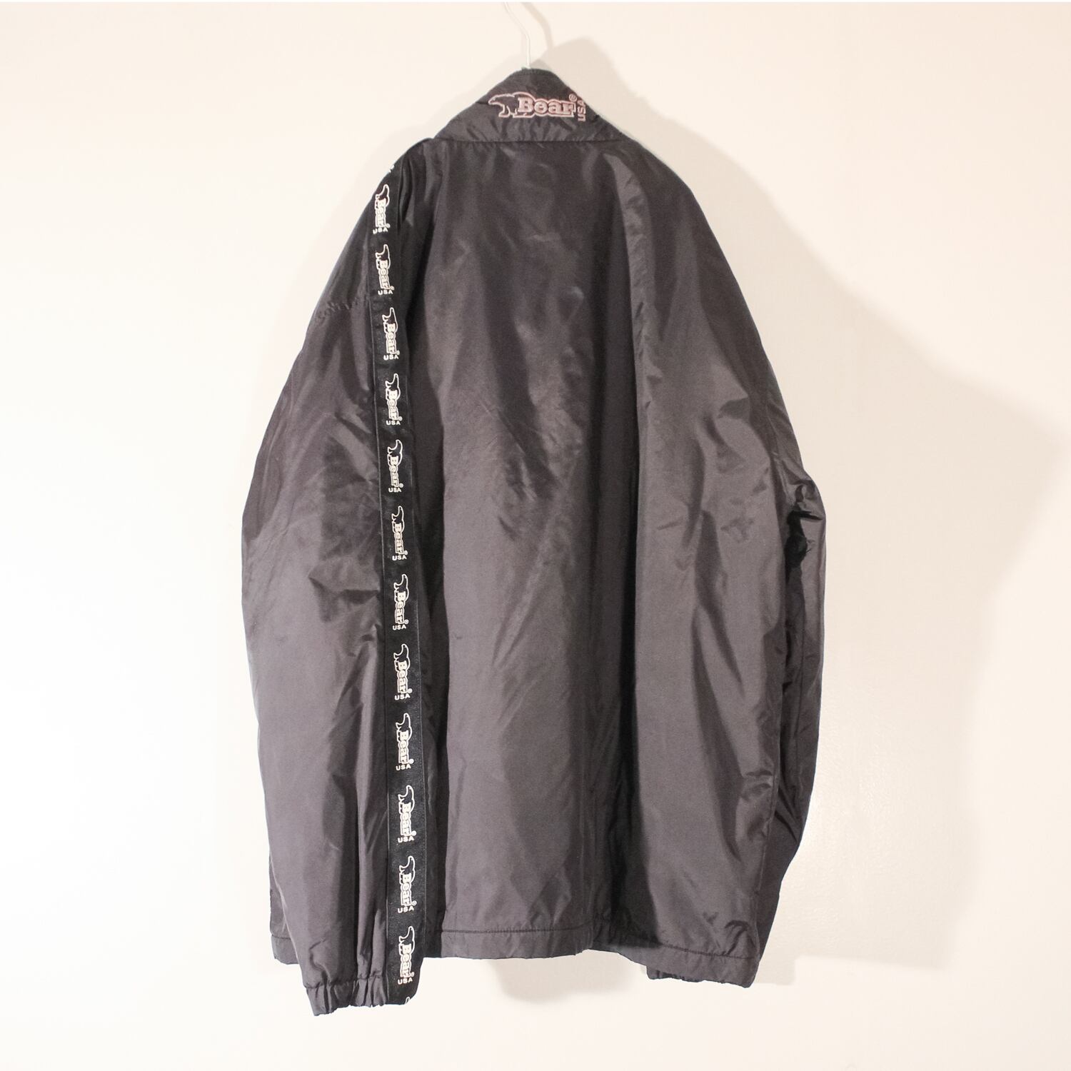 【 90s ★ ラインジャケット 】 90s Bear USA side logo nylon jacket black , used vintage - Bear USA ナイロンジャケット サイド ロゴ プリント 袖 裏起毛 フリース メンズ 黒 XL ゆったり ゆるダボ オーバーサイズ ヴィンテージ古着 原宿 高円寺 下北沢
