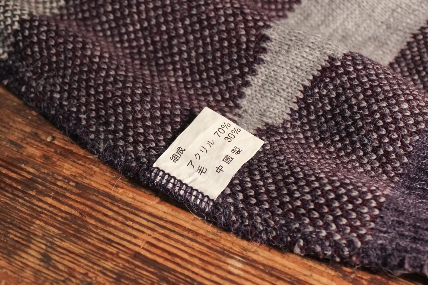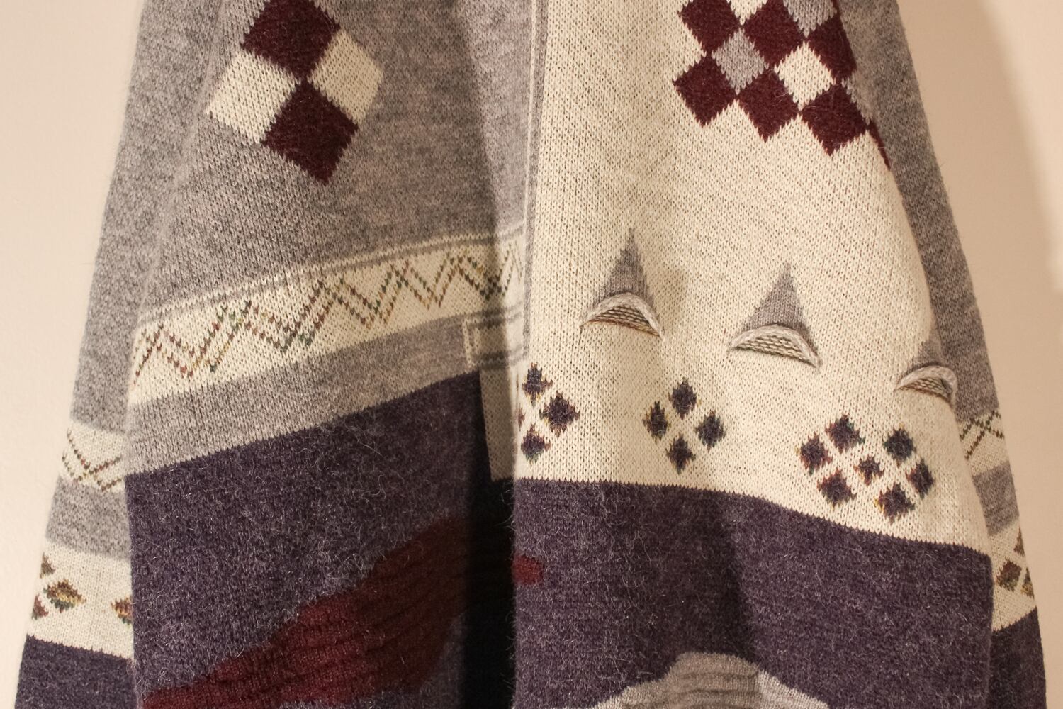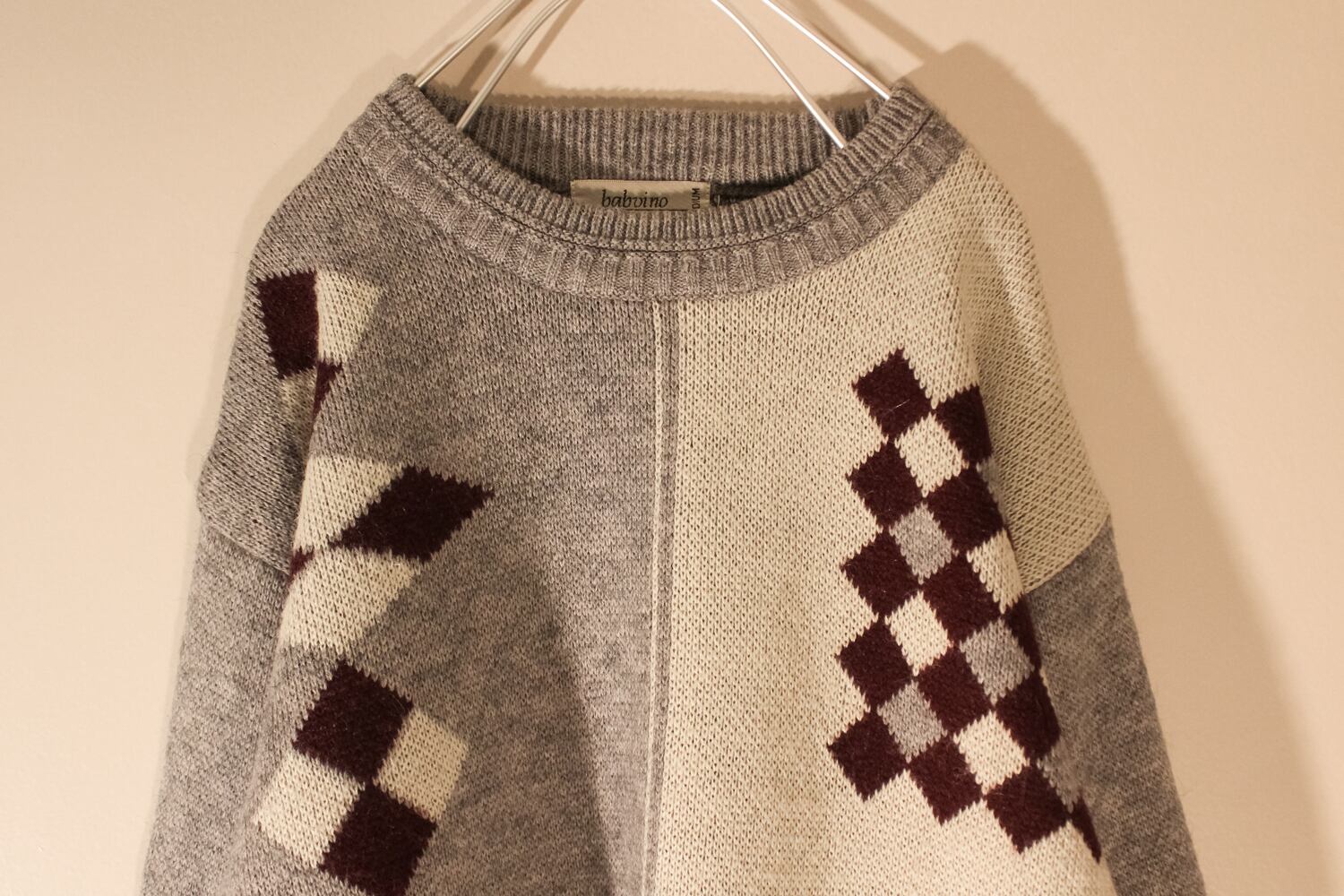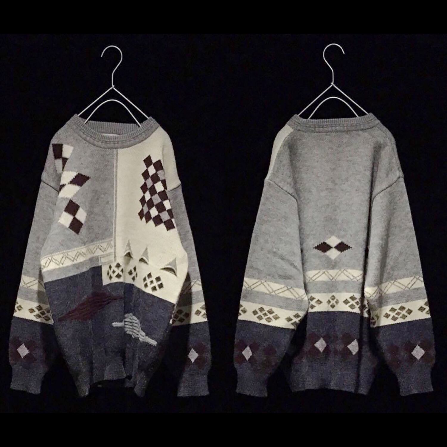 やや3D。チェック柄や三角形の総柄がほっこりかわいらしい、ゆるい雰囲気の総柄ニットです。サイズ感はM〜L程度。