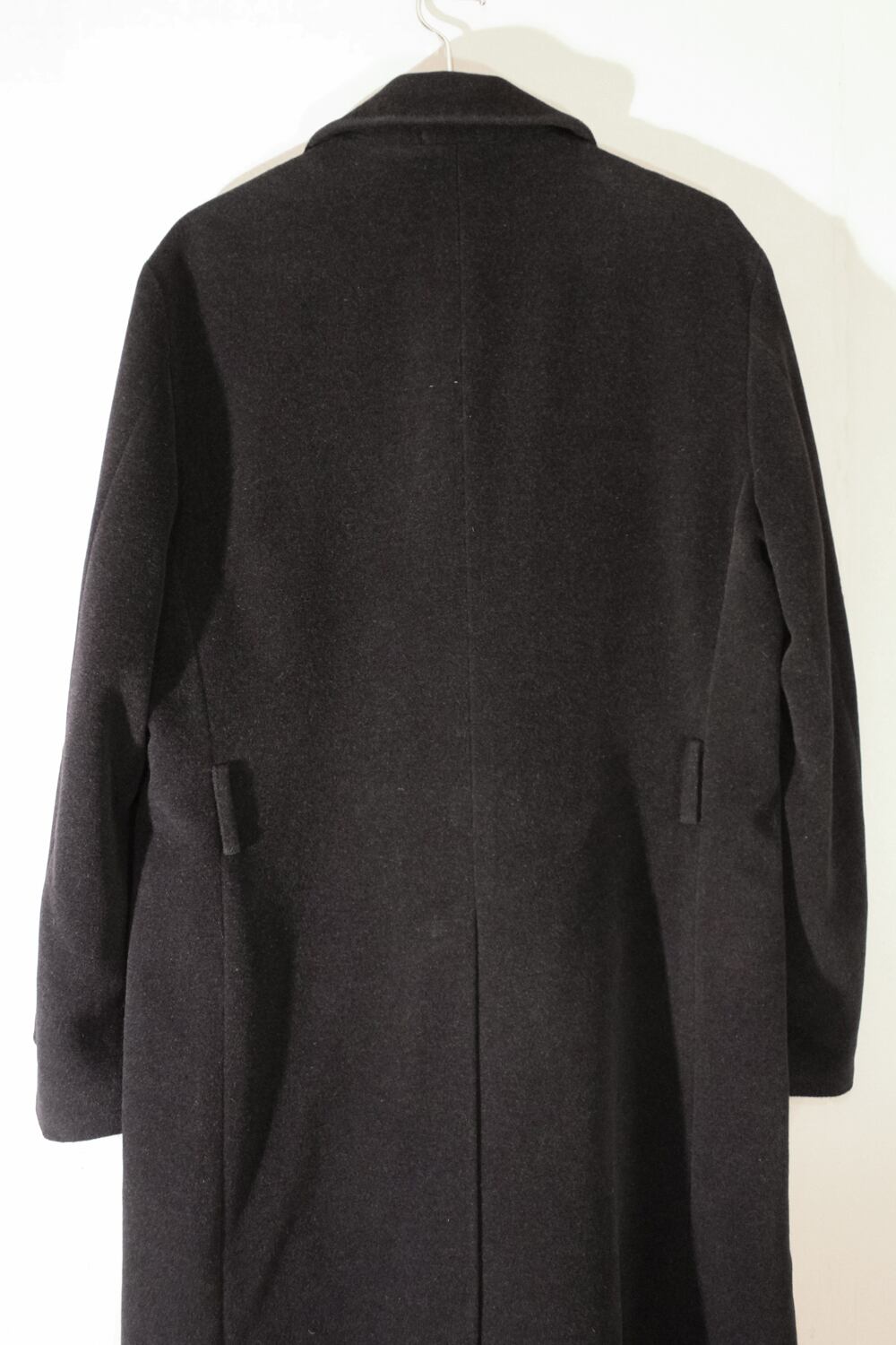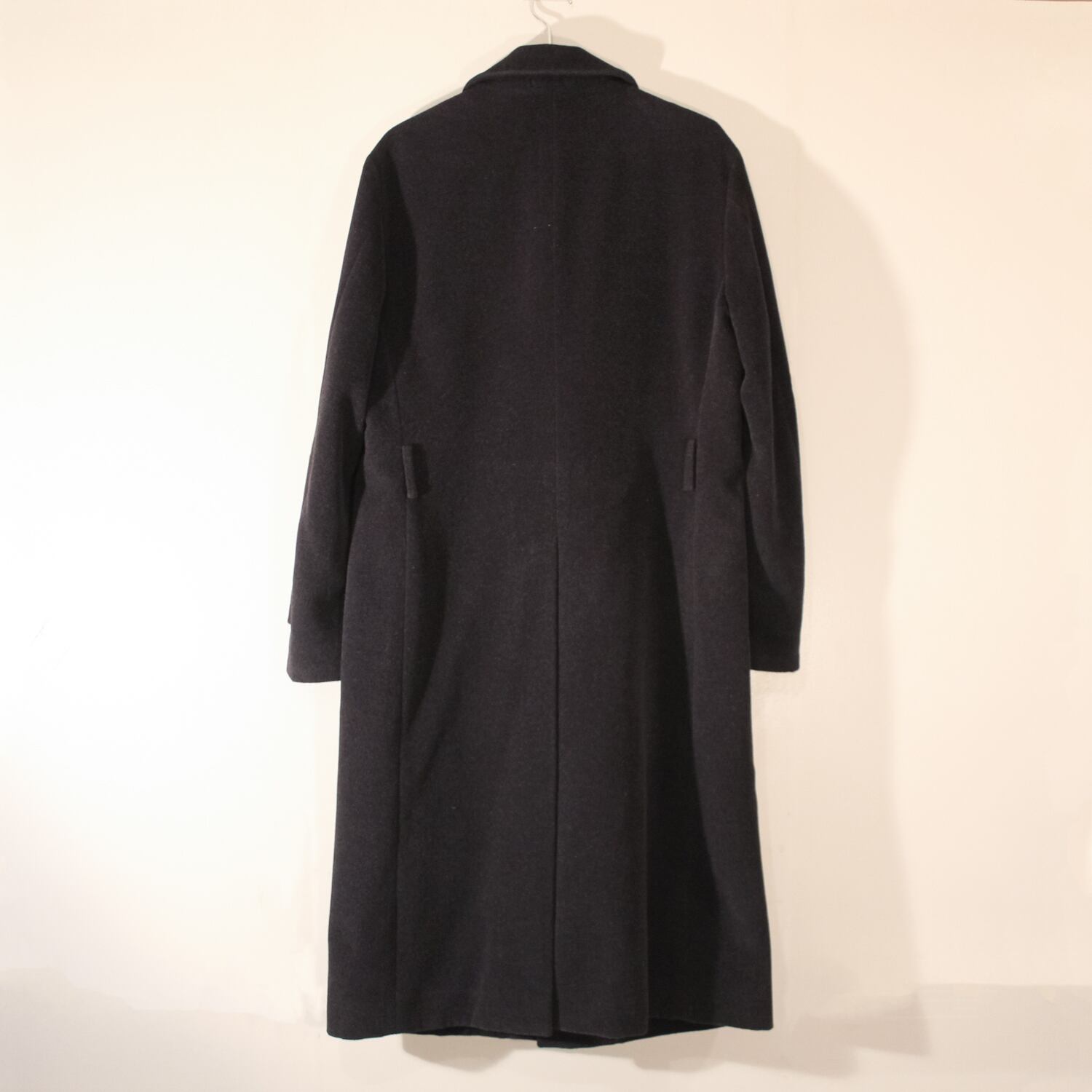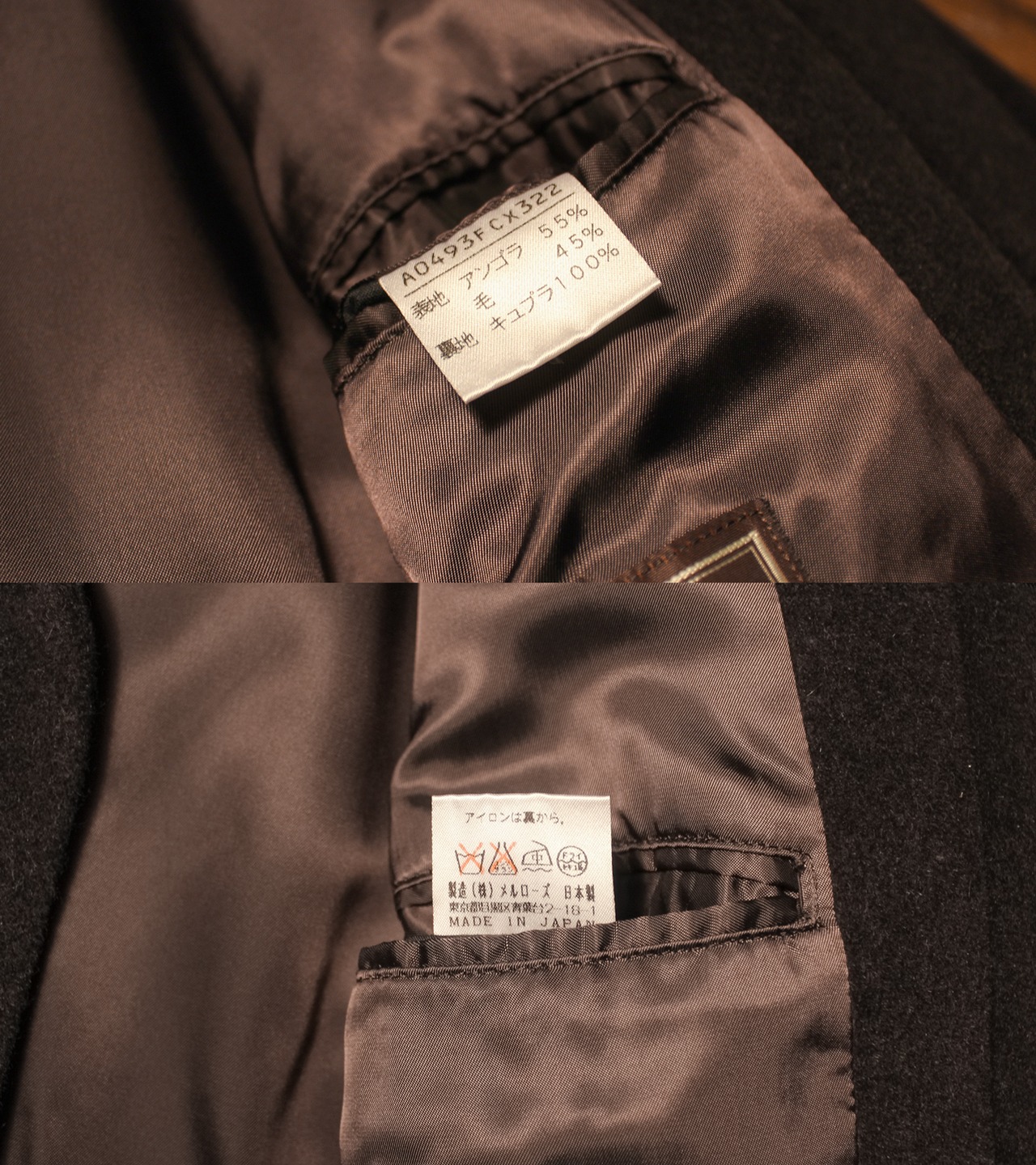 90年代後期〜00年代頃。日本製のアンゴラ混のロングコートです。ブランドは、メンズメルローズのフォーマル・ドレスラインである、MEN’S MELROSE Complet。現在のことはよく知りませんが、この時代のこのラインでは、ベーシックかつ質にこだわった製品が作られていたように思います。アンゴラコートはウールなどとのミックスが普通ですが、55%のアンゴラが使われており、滑らかな手触りで、見た目も柔らかい印象です。カラーは明るめの黒で、良い雰囲気。価格帯は8万〜10万円程度。ベルトは欠品。キズ汚れなく、綺麗な美品です。