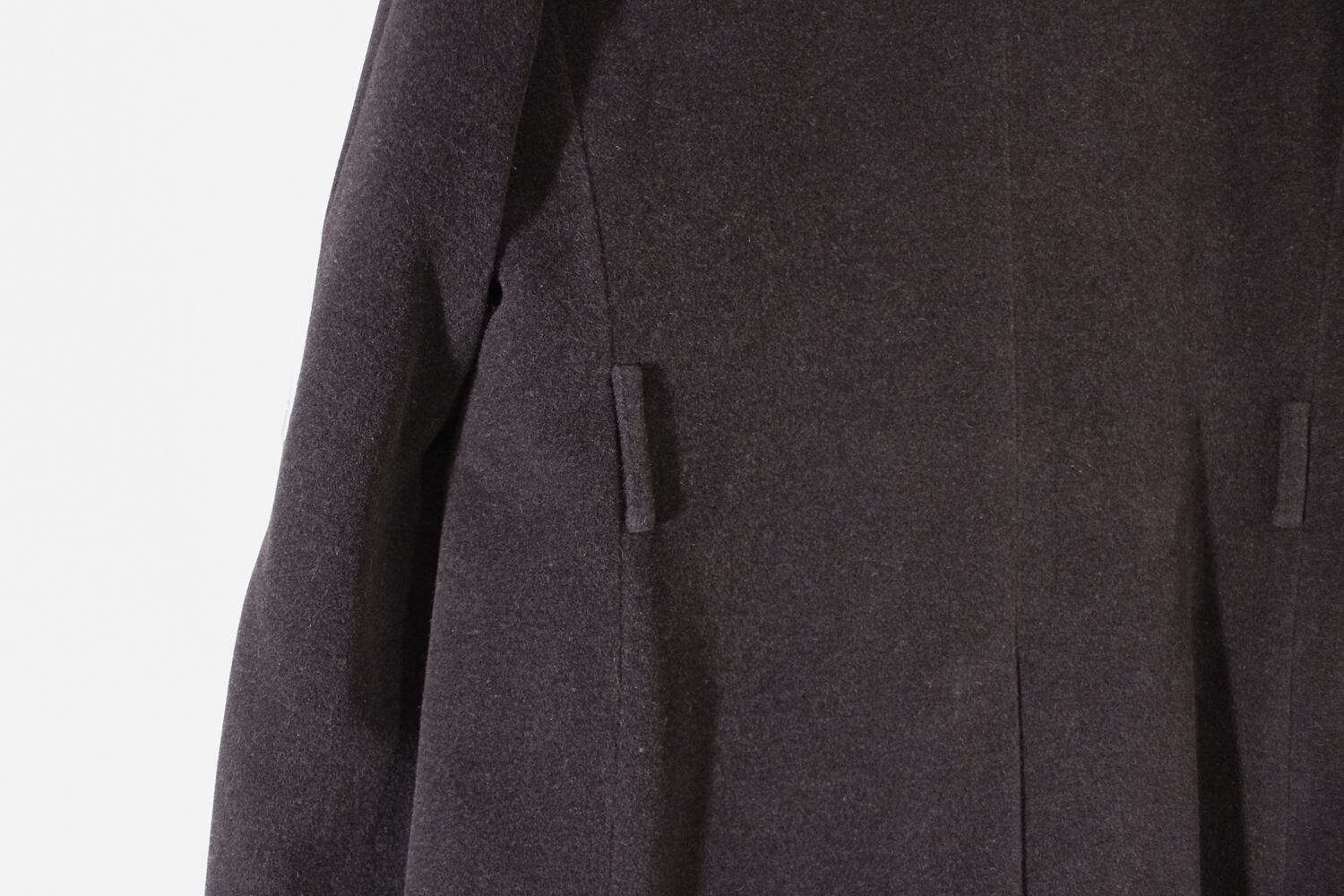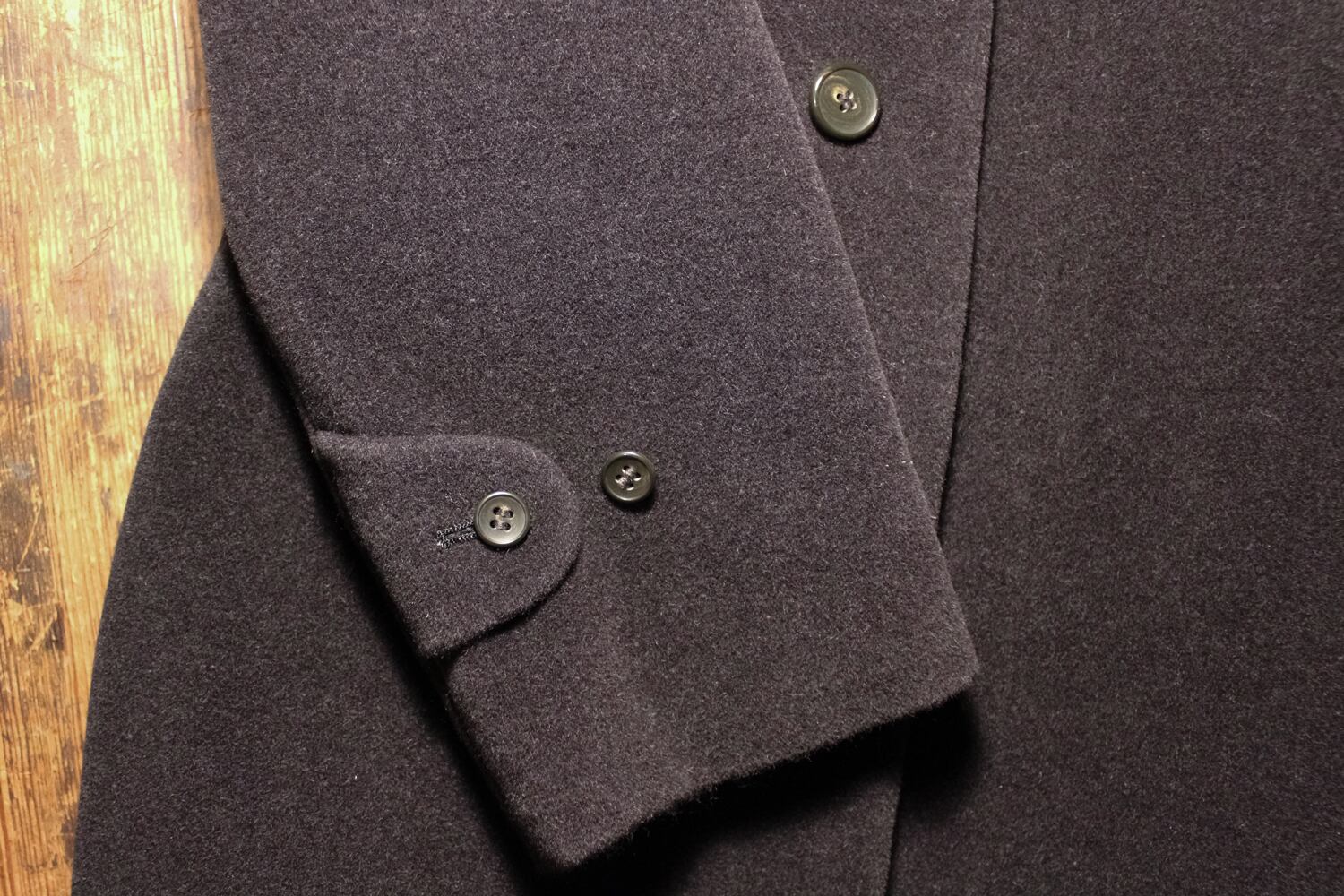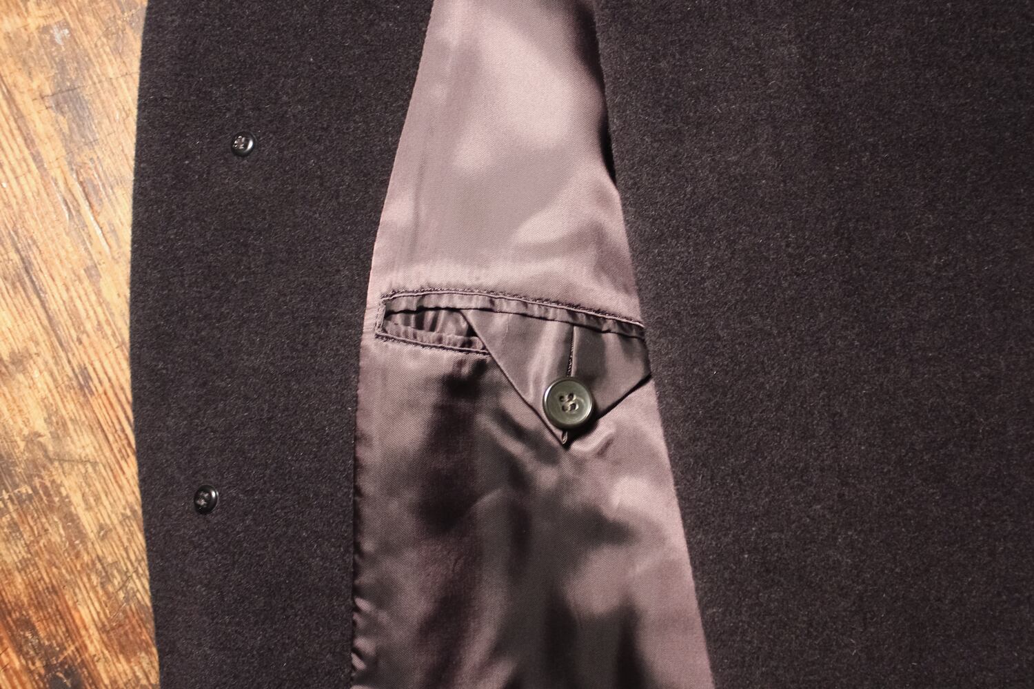 90年代後期〜00年代頃。日本製のアンゴラ混のロングコートです。ブランドは、メンズメルローズのフォーマル・ドレスラインである、MEN’S MELROSE Complet。現在のことはよく知りませんが、この時代のこのラインでは、ベーシックかつ質にこだわった製品が作られていたように思います。アンゴラコートはウールなどとのミックスが普通ですが、55%のアンゴラが使われており、滑らかな手触りで、見た目も柔らかい印象です。カラーは明るめの黒で、良い雰囲気。価格帯は8万〜10万円程度。ベルトは欠品。キズ汚れなく、綺麗な美品です。