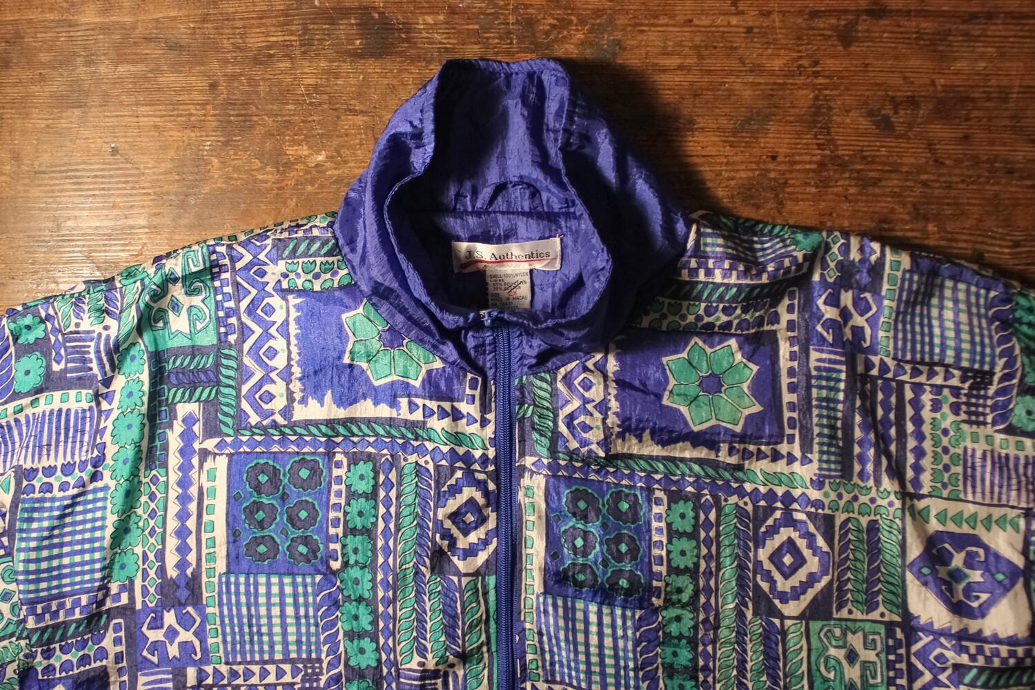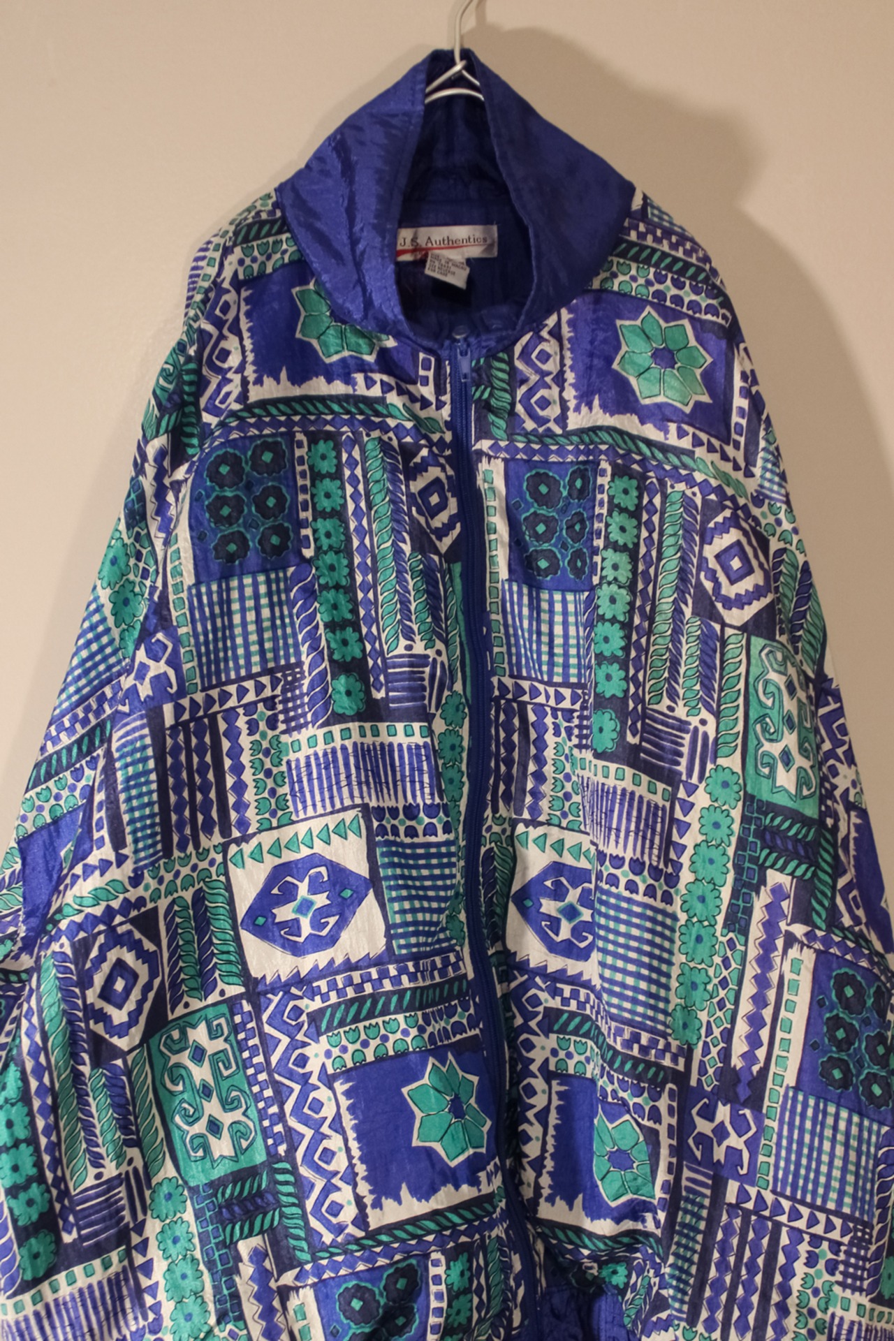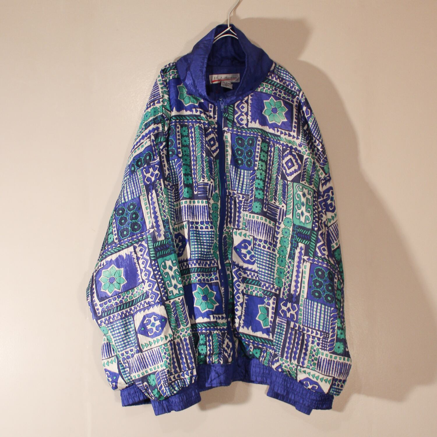 【 80s - 90s USA古着 ★ ゆるい総柄 】 pop geometric nylon orversized blue jacket - used, vintage / レトロ 幾何学 図形 ナイロンジャケット 総柄ジャケット ブルゾン ウィンドブレーカー ゆったり ゆるだぼ オーバーサイズ メンズ レディース XXL アウター ヴィンテージ