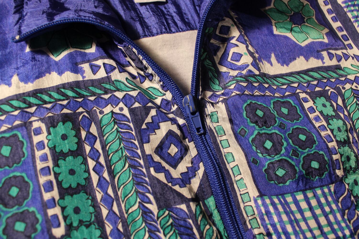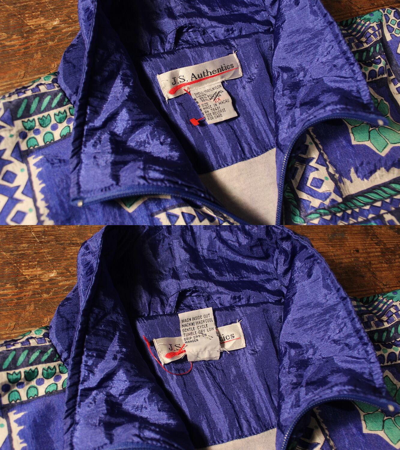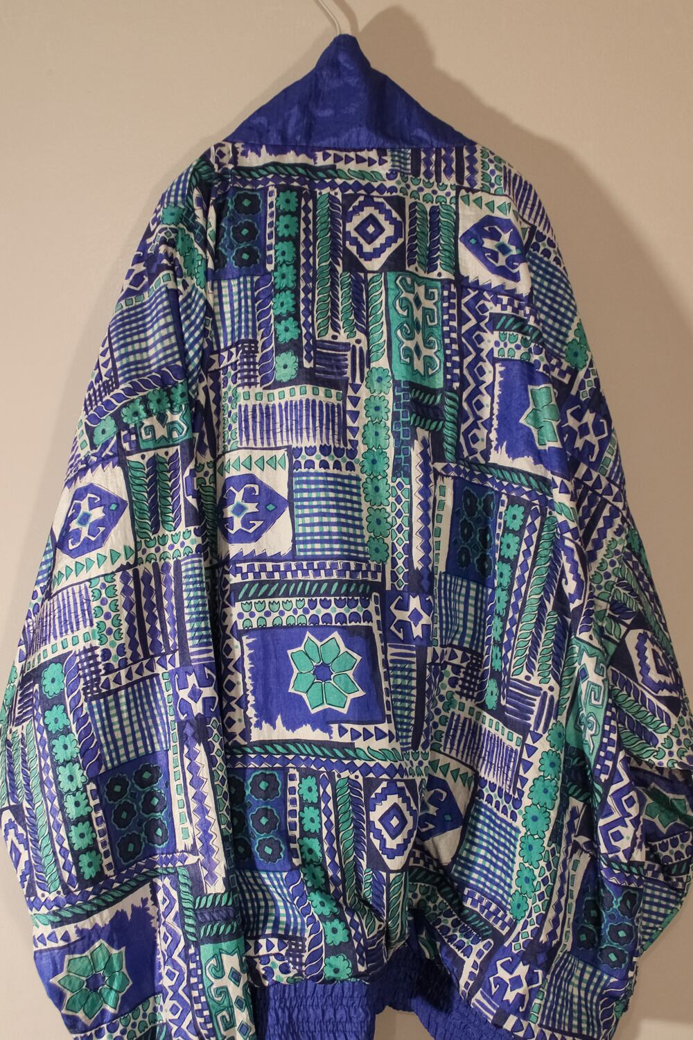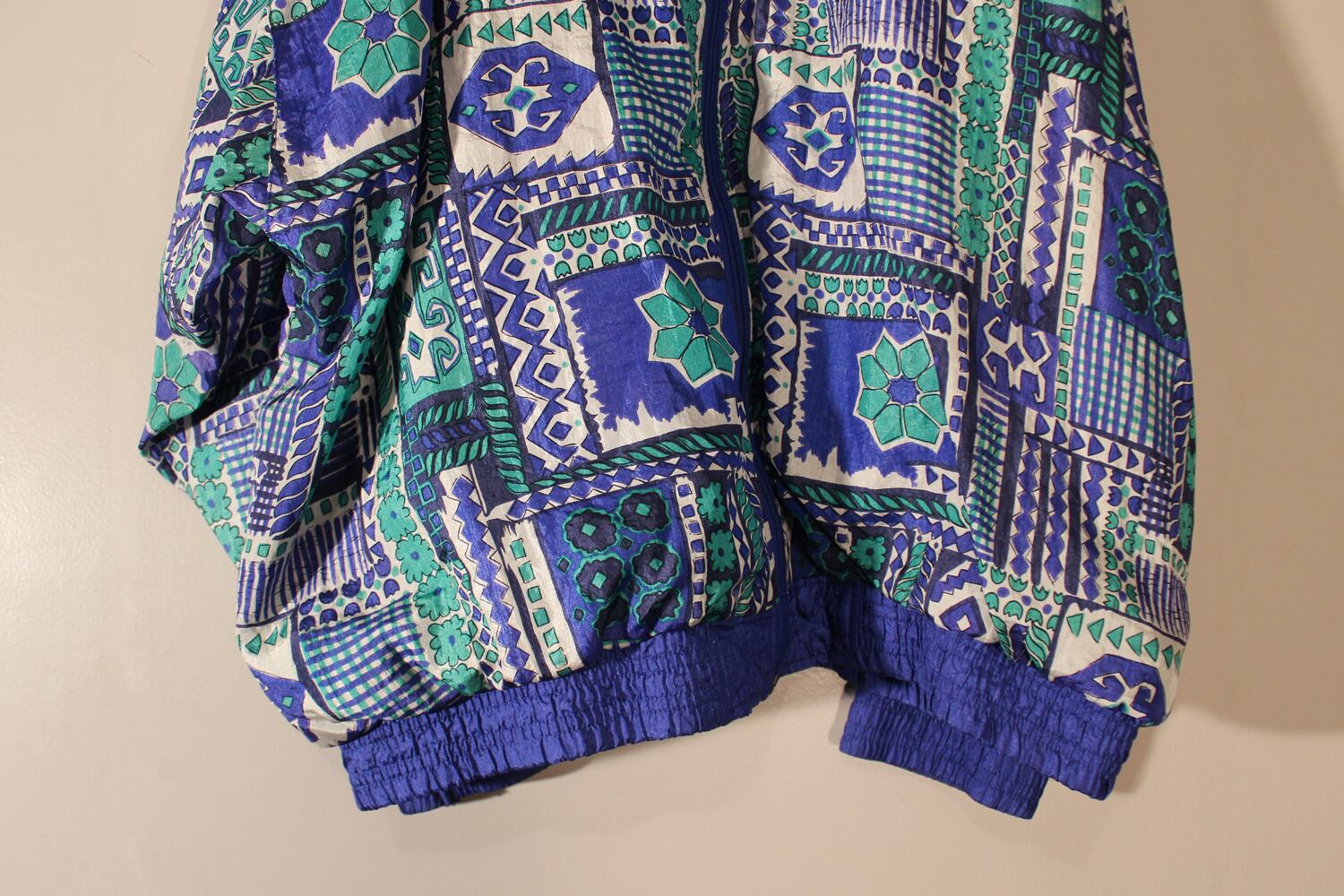 【 80s - 90s USA古着 ★ ゆるい総柄 】 pop geometric nylon orversized blue jacket - used, vintage / レトロ 幾何学 図形 ナイロンジャケット 総柄ジャケット ブルゾン ウィンドブレーカー ゆったり ゆるだぼ オーバーサイズ メンズ レディース XXL アウター ヴィンテージ
