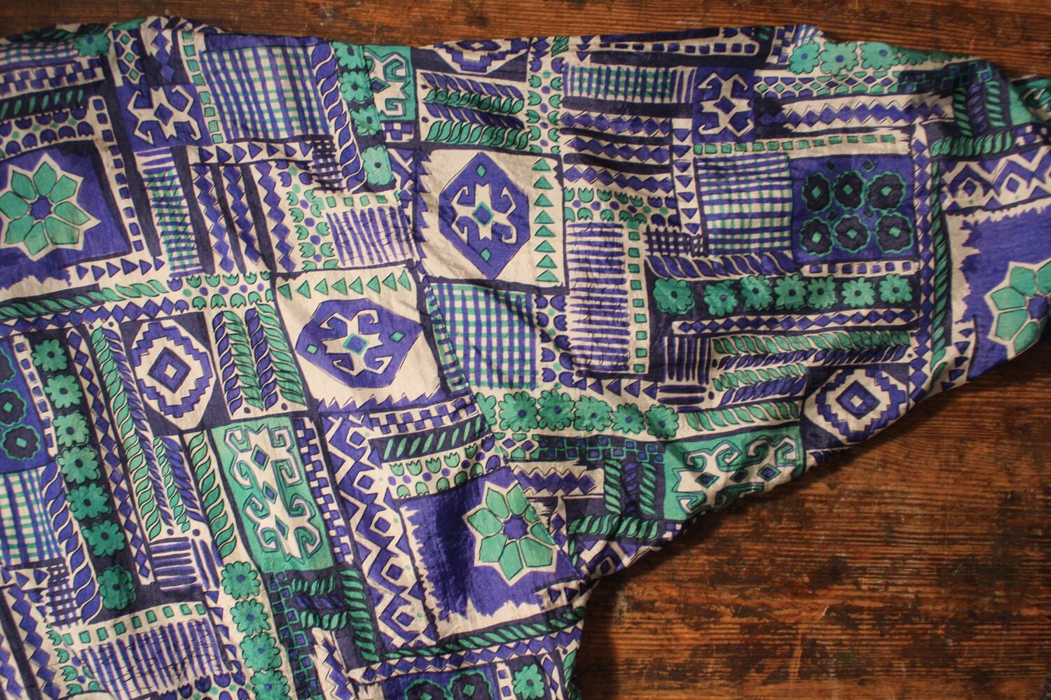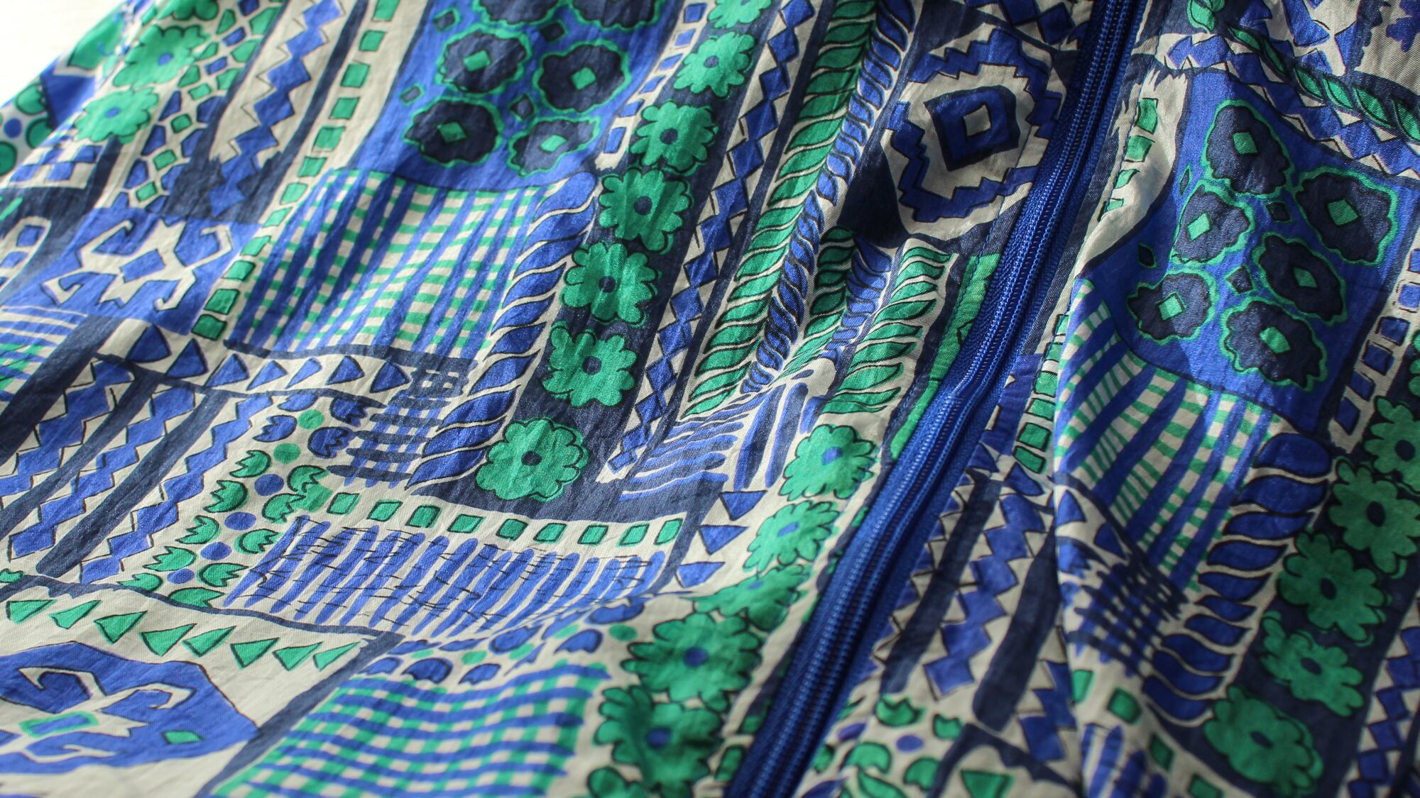 USAヴィンテージのオーバーサイズナイロンジャケット。ゆるくかわいらしい雰囲気の細かい図形が散りばめられた、クリエイティビティを刺激しそうな総柄。かなりゆったりとした身幅(71)で、アームも太め。メンズXXLくらい。ユニセックスでどうぞ。