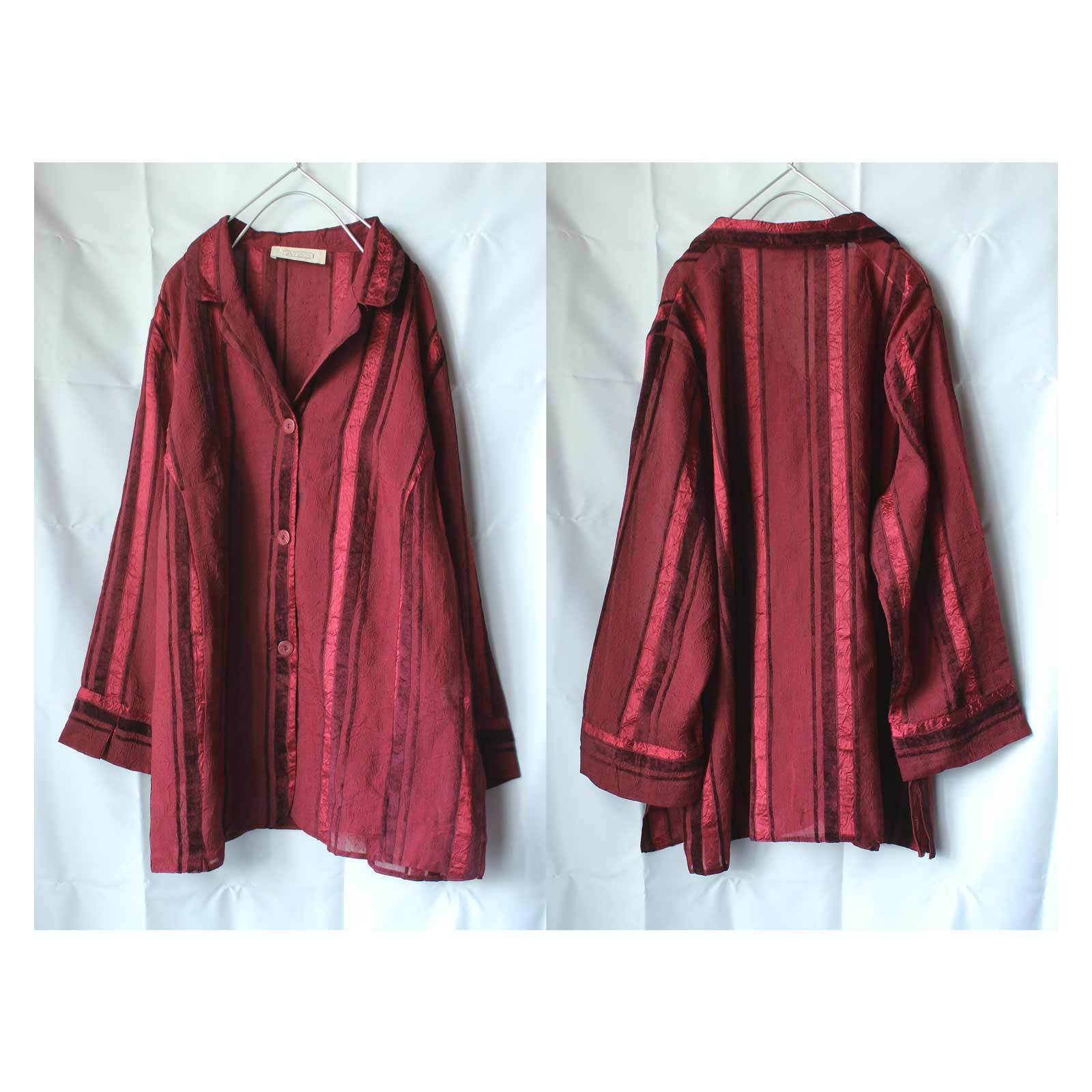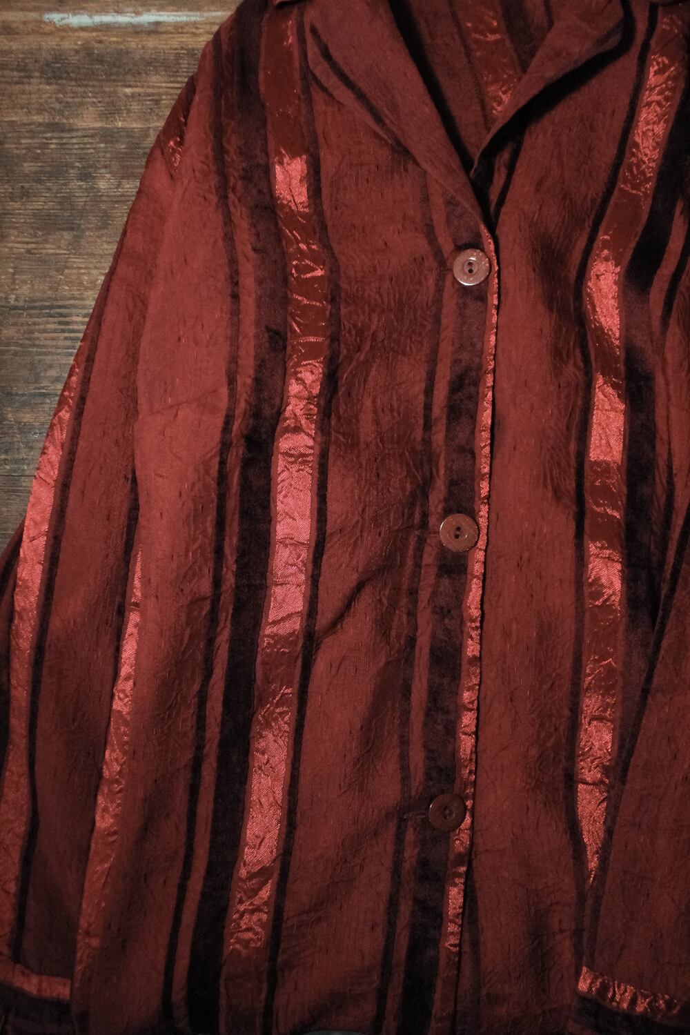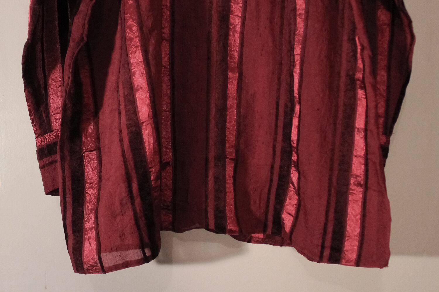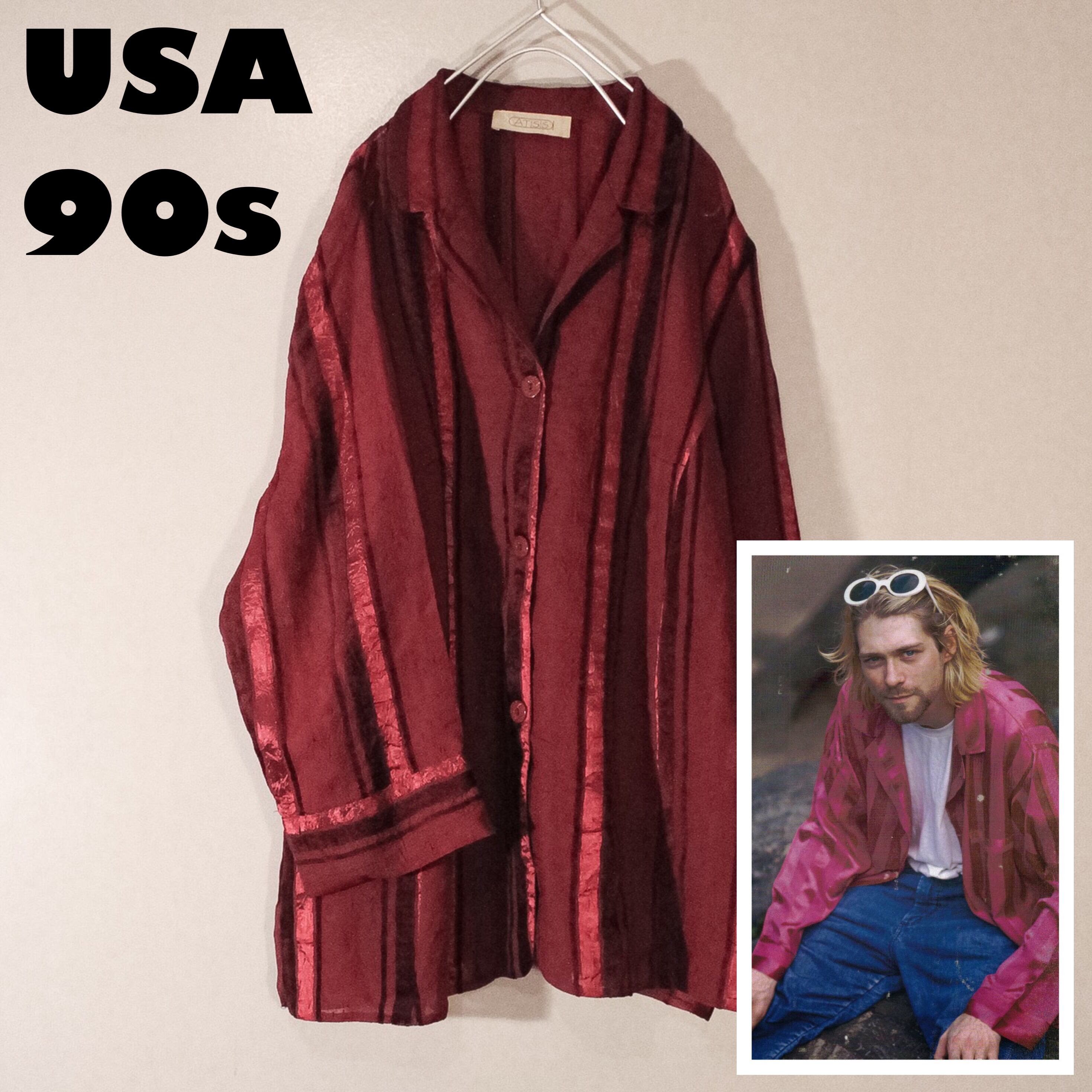 【 90s USA古着 ★ カートコバーン系 】velvet mixed striped smokey red shirt - used, vintage [ スモーキーレッド / ベロア ] ストライプ柄 レーヨン混 開襟シャツ オープンカラー パジャマシャツ長袖 七分袖 八分 半端袖 ベルベット 赤 | ゆったり メンズS レディースM グランジ ニルヴァーナ ヴィンテージ