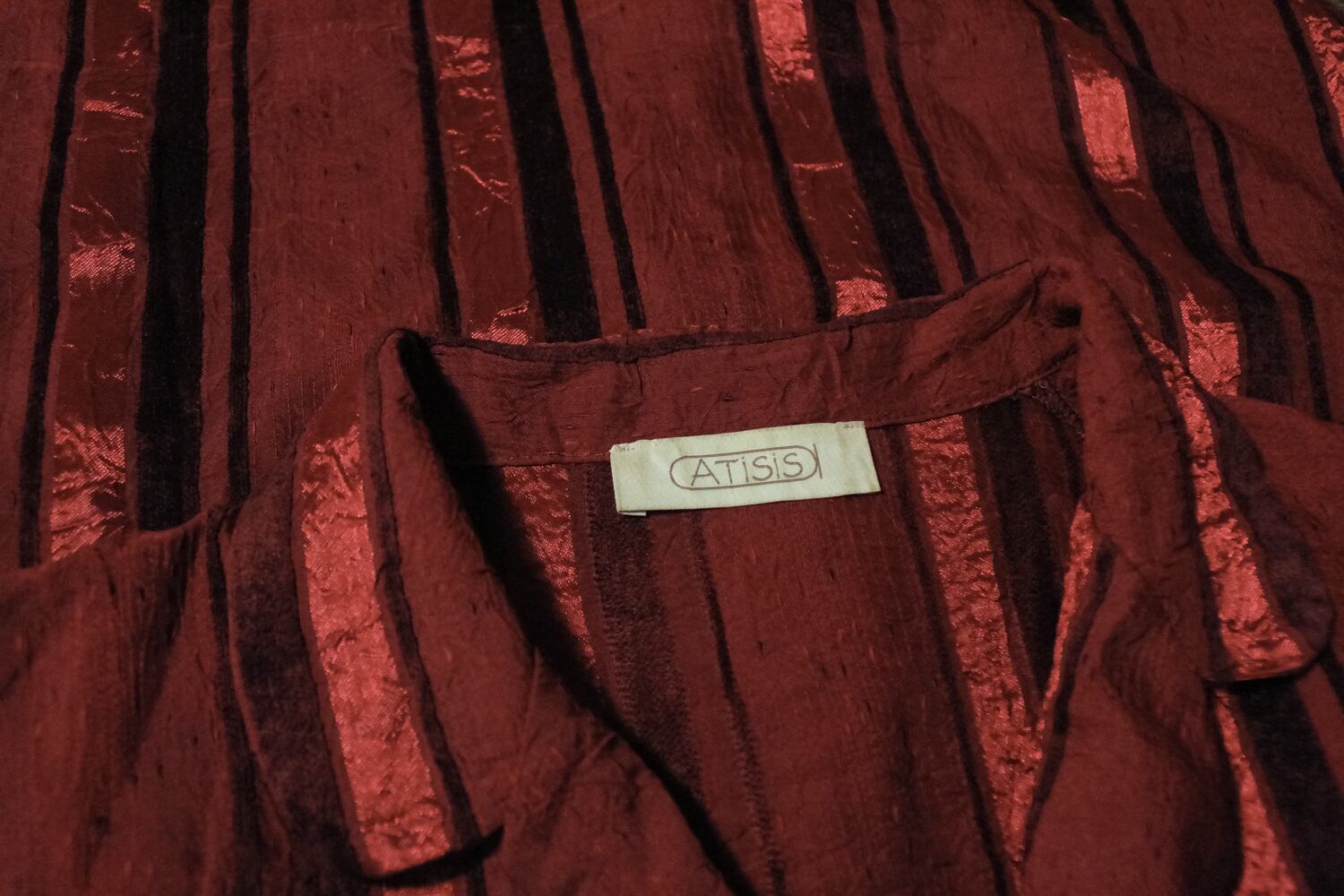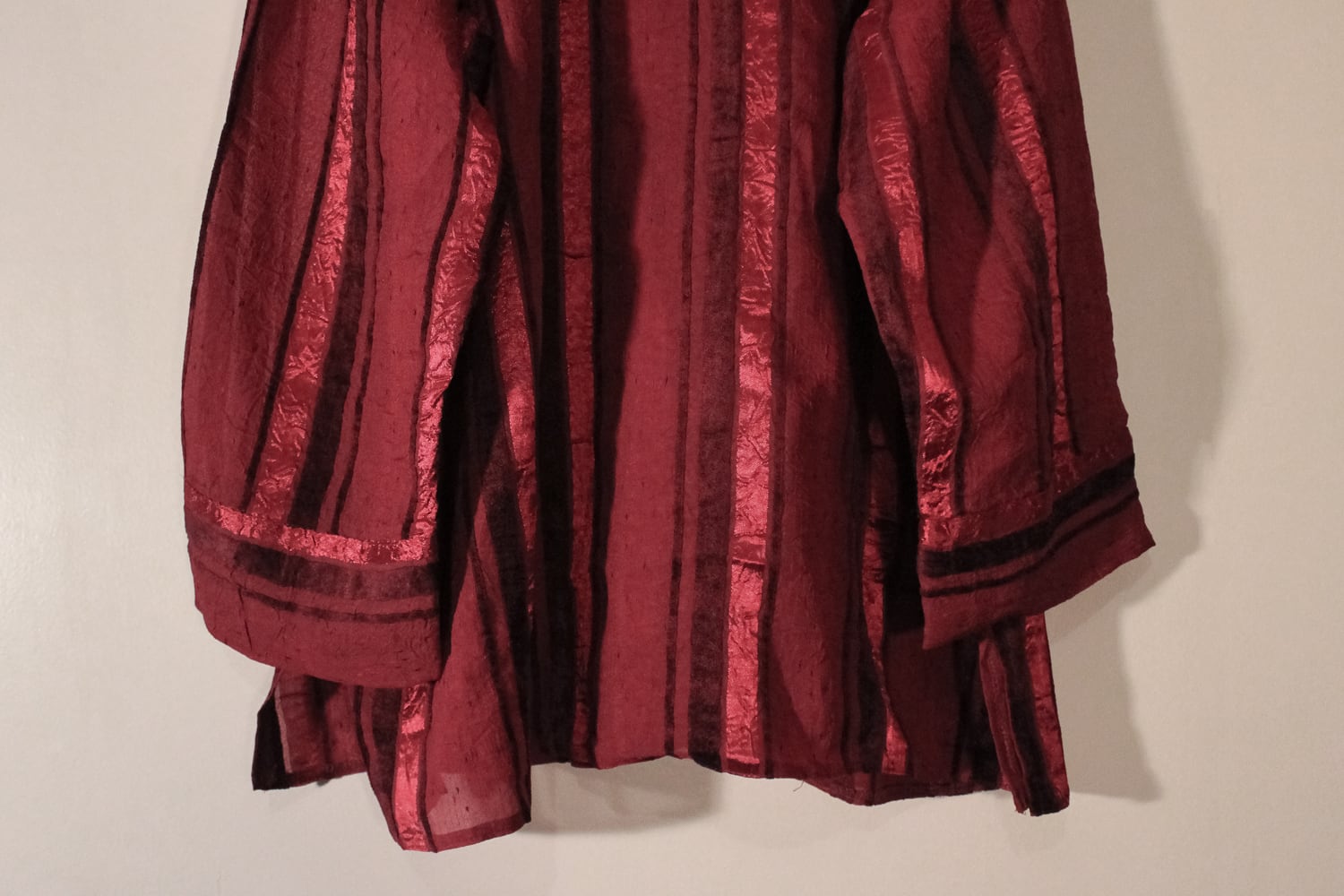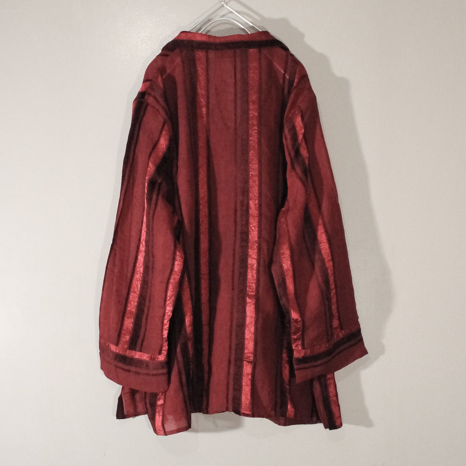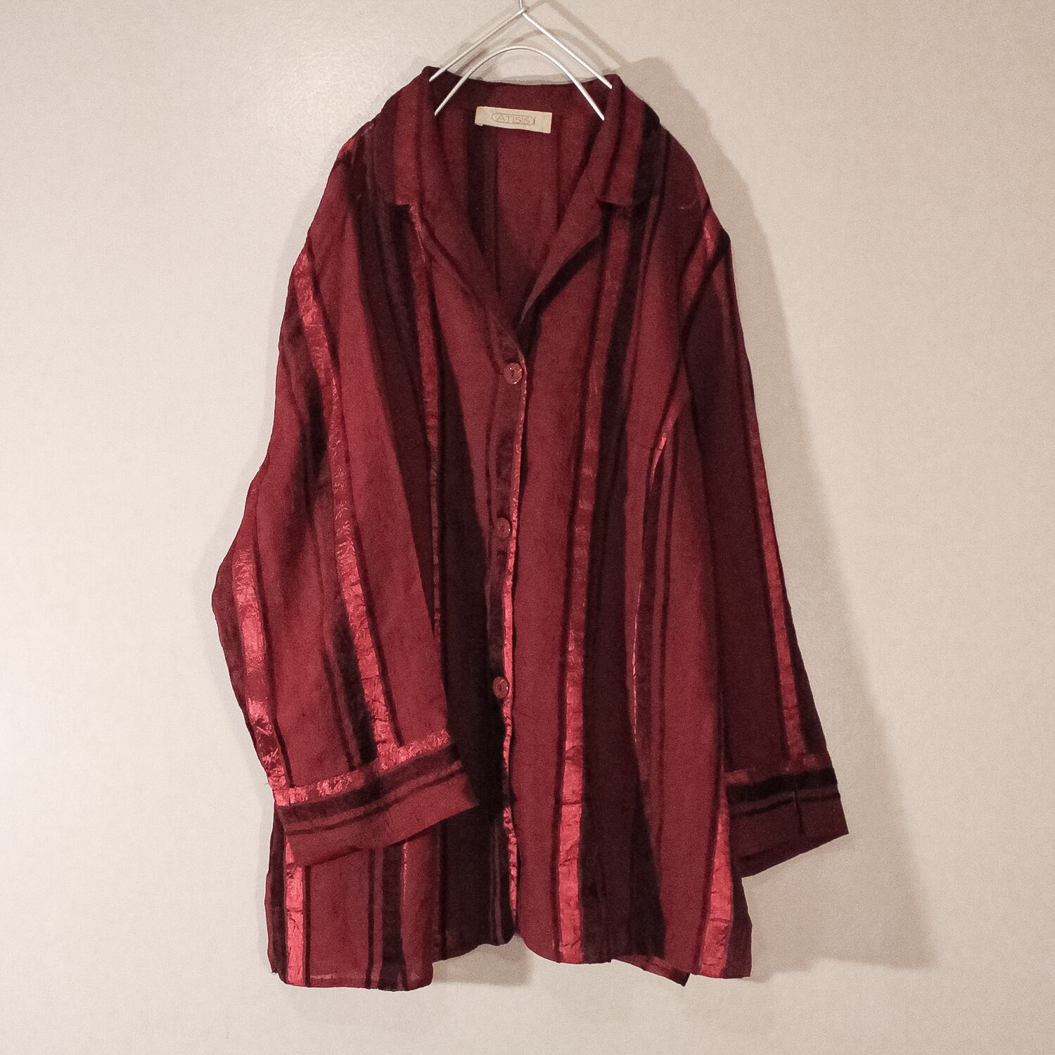 【 90s USA古着 ★ カートコバーン系 】velvet mixed striped smokey red shirt - used, vintage [ スモーキーレッド / ベロア ] ストライプ柄 レーヨン混 開襟シャツ オープンカラー パジャマシャツ長袖 七分袖 八分 半端袖 ベルベット 赤 | ゆったり メンズS レディースM グランジ ニルヴァーナ ヴィンテージ