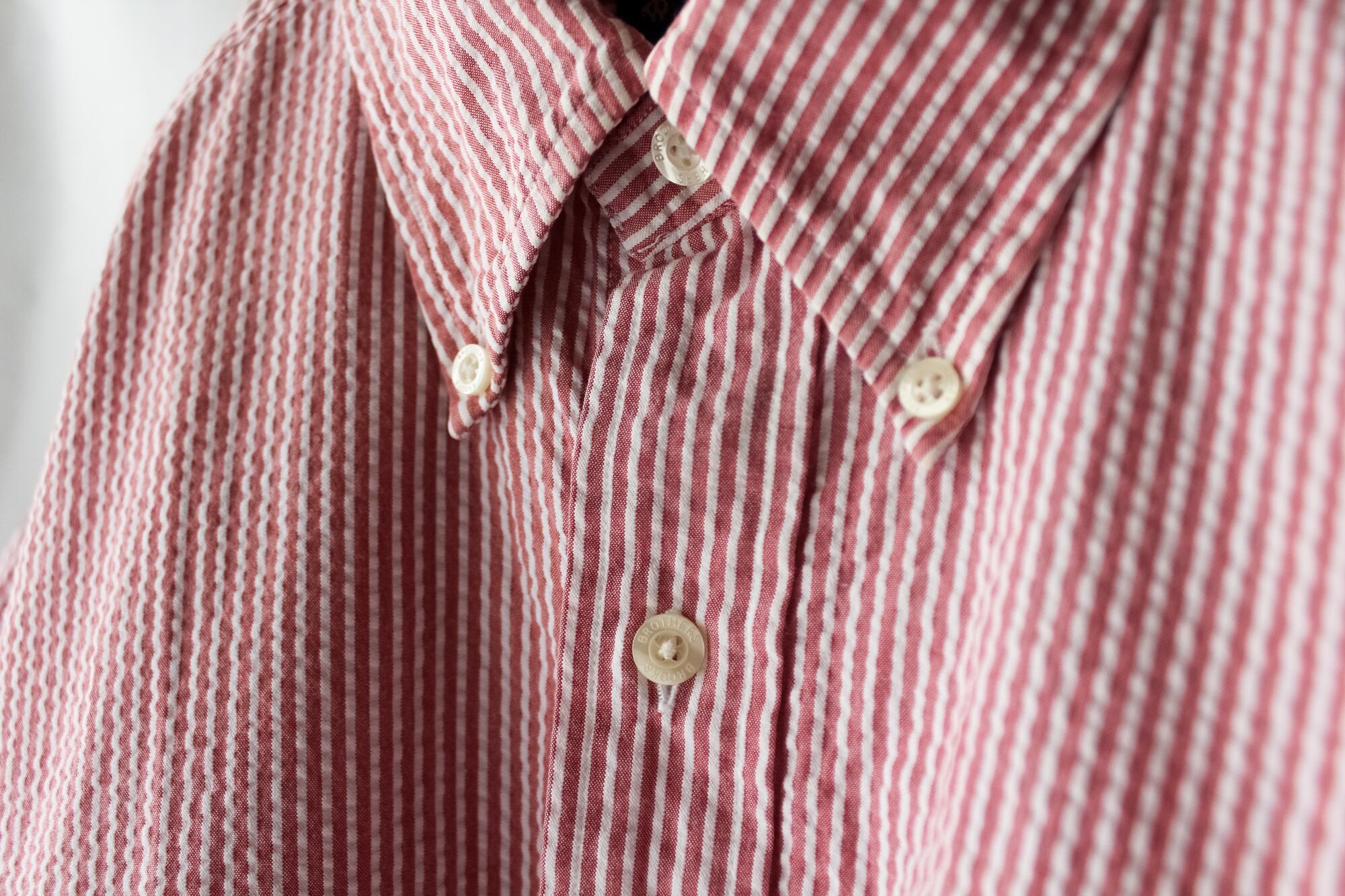#ブルックスブラザーズ の元祖 #ボタンダウンシャツ です。「元祖」というのは、ボタンダウンシャツが考案したのが、他でもない #brooksbrothers だからです。ゆるくシワ加工が施されており、シワになりにくい素材です。一番下のボタンが外れた状態で撮影されていますが、実際にはボタンはついています。